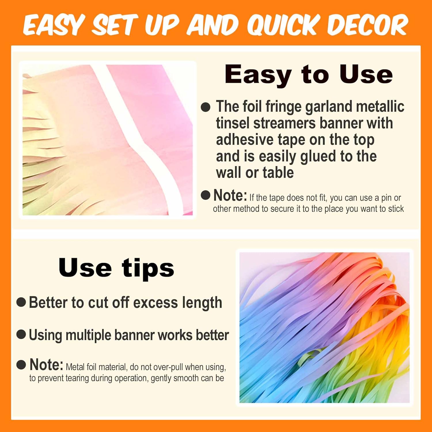 • Use Tips: You can cut the foil fringe garland banner streamers with scissors into the suitable Length, assemble the party streamers side by side to make the backdrop larger. If you want to make your foil fringe garland look fuller and thicker, you can overlap two garland, also overlap foil fringe garland in different colors to create a beautiful party easily