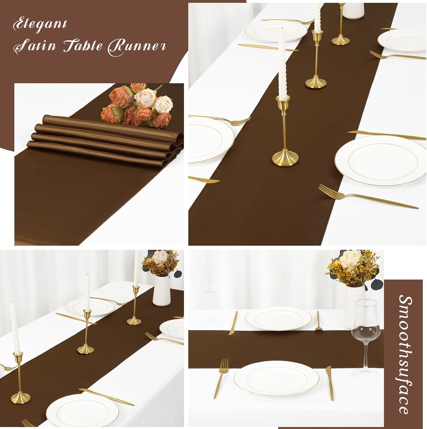 • 🧀【Brown Satin Table Runner Set】12 Pack brown satin table runner measures 12" x 108" in size, appropriate for a table that can seat 8-10 people. This satin table runner can fit a 6ft/8ft rectangular table or round table well.This satin table runner is great for event table decorations.Our satin table runner make your dining table more dazzling and outstanding.Purchase our 12piece satin table runner and save even more.