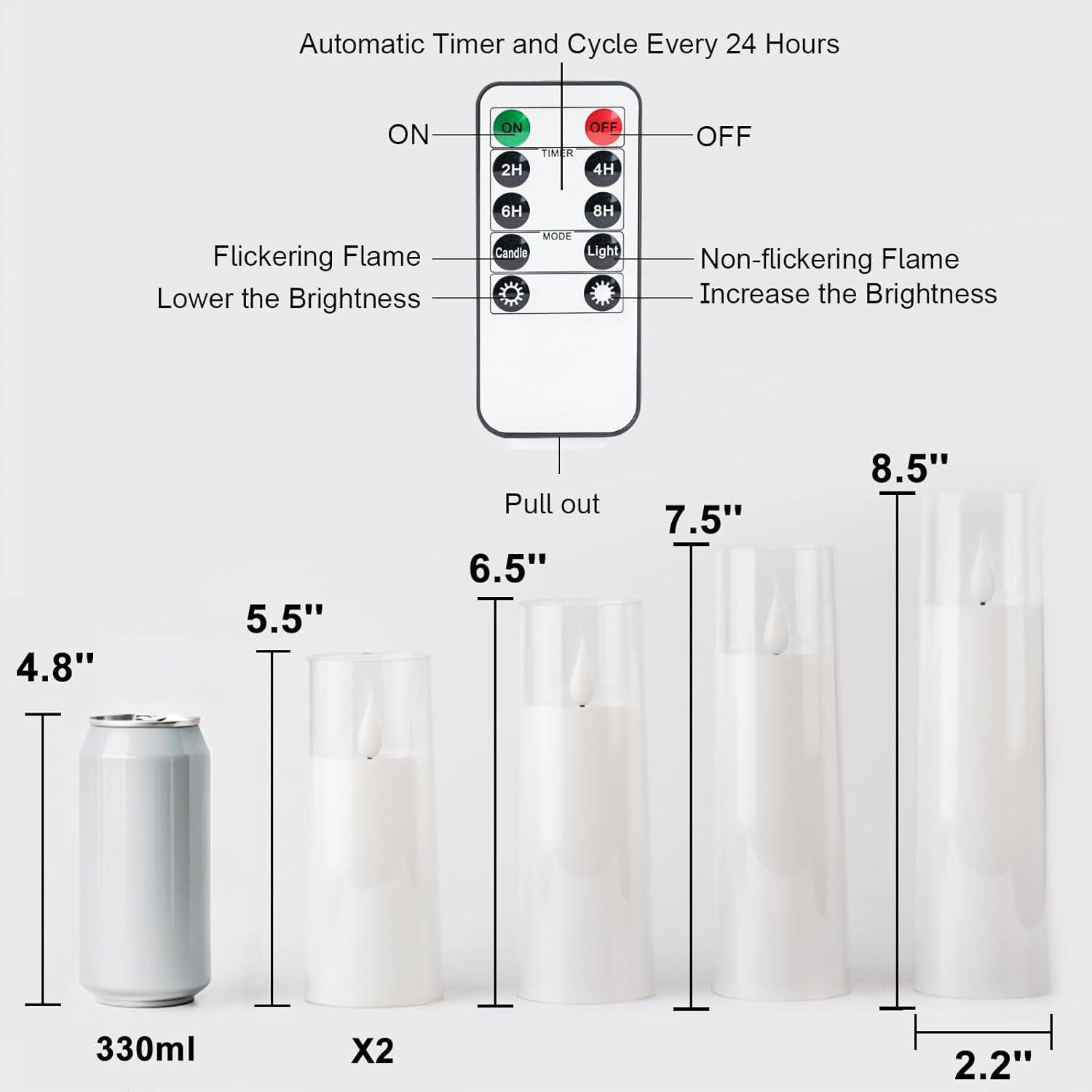 • Package Includes: This battery operated candle set includes five flameless pillar candles( D2.2”x H5”5”6”7”8”), a 10-key remote control, and a user manual. Each flameless candle is powered by 2 x AA batteries (Not included) which can last for 500+ hours