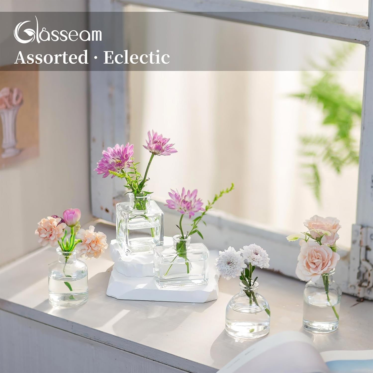 • Assorted Glass Bud Vase: These mini vases' varied shapes gives an eclectic feel and also adds a unique charm to any room; They are chic enough to appreciate on their own, and simultaneously highlight the unique beauty of your plants when paired with flowers
