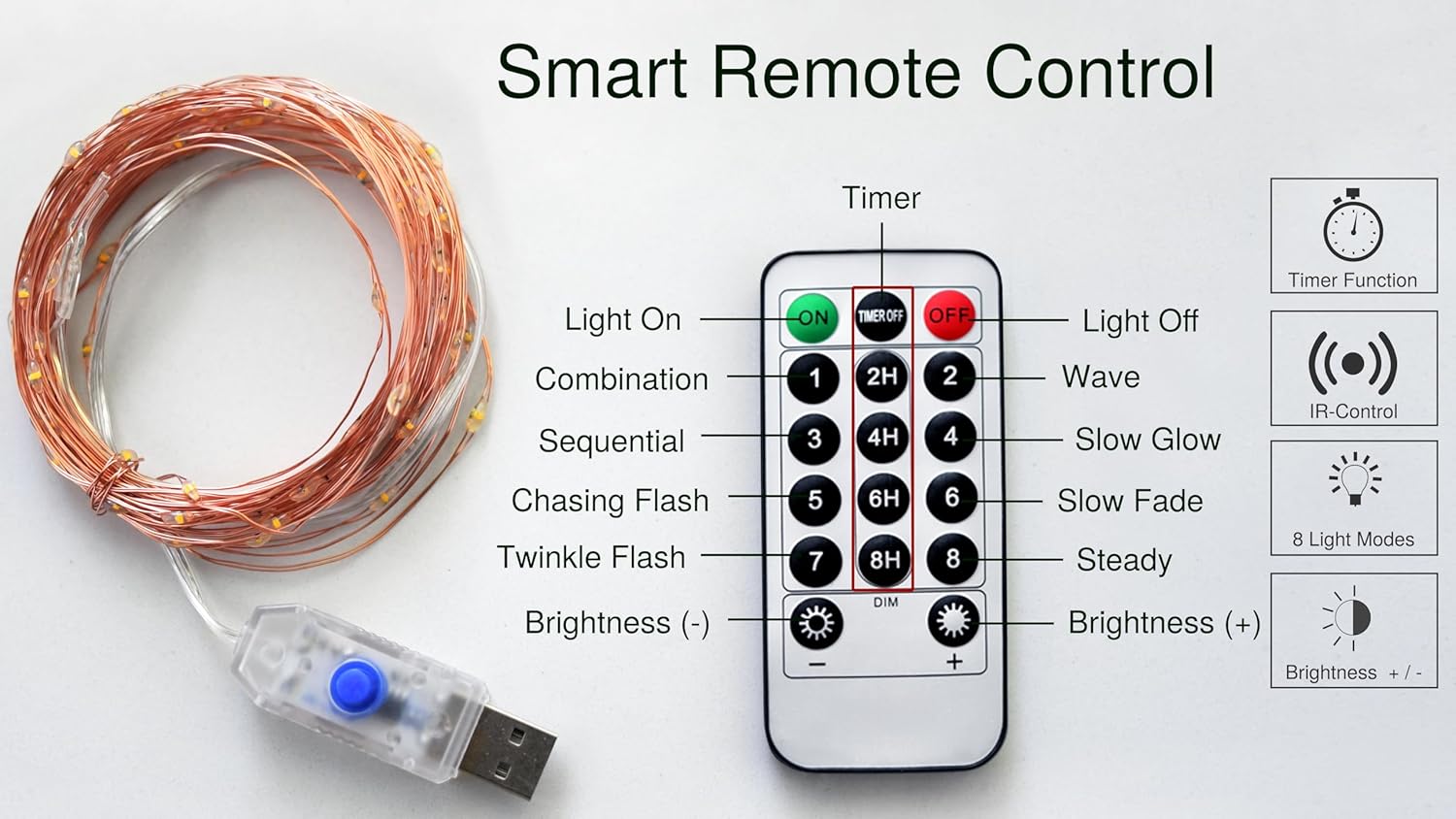 • Set the perfect mood with USB-powered lights: From a romantic twinkle to a steady warm white glow or a festive flash, cycle through eight lighting modes using the remote control. Adjust brightness and set timers to create a dreamy atmosphere for any occasion, all with the convenience of USB power. Perfect for indoor and outdoor use (please keep USB connector dry).