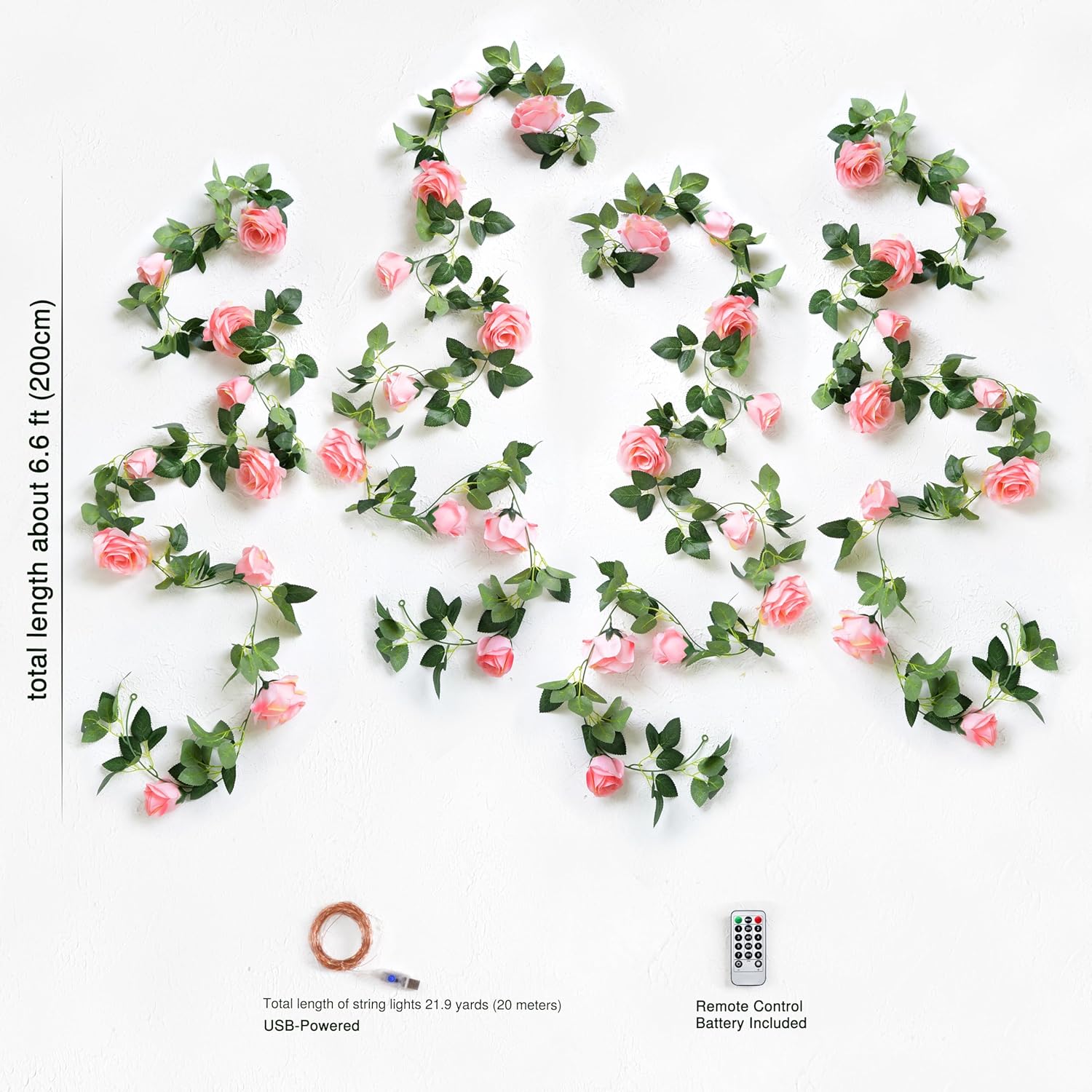 • What's Inside: Four pink rose garlands paired with one string of fairy lights, beautifully packaged in a gift-ready box from FiveSeasonStuff. Each garland is 7.1 feet long, and the string light measures 65.6 feet with 200 LEDs spaced 10 cm apart. The lights are waterproof, but the USB is not. Technical details: Input voltage 5V, wattage 1.35W, luminous flux 20lm, power factor 0.06W/piece.