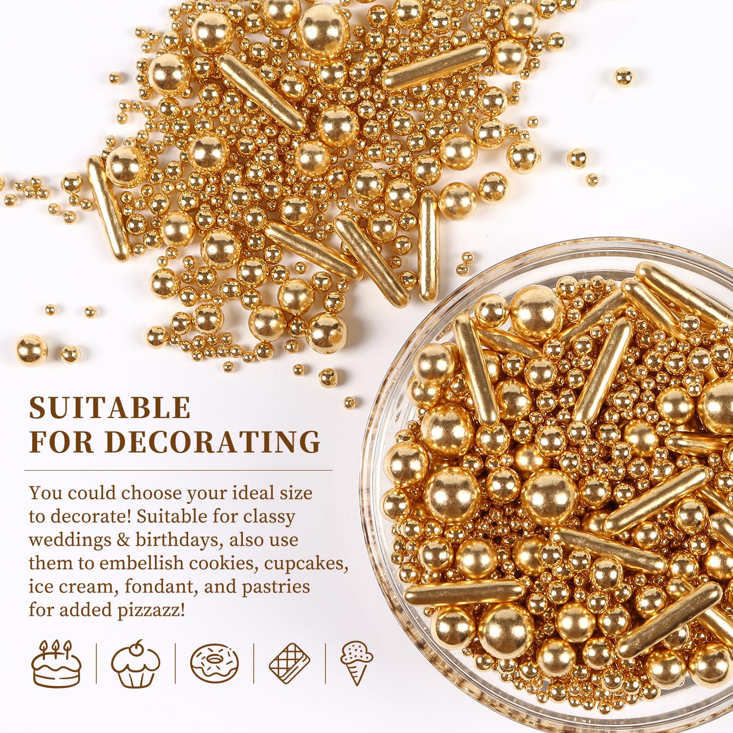 • Sprinkles for Cake Decorating: The perfect gold pearl and rod sprinkles for cakes, cupcakes, ice cream, cookies, macarons, donuts, and more. Make them sparkle and 3D. It's best for decorating after your items have already been baked, avoid melting during baking.