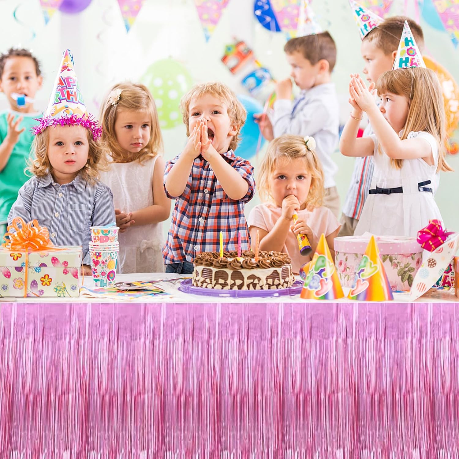 4 Pack Metallic Foil Fringe Tinsel Table Skirts,29x108 Inch Party Disposable Table Skirt Banner for Hotel Banquet Parade Floats Mardi Gras Holiday Birthday Wedding New Year Party Decoration(Pink)