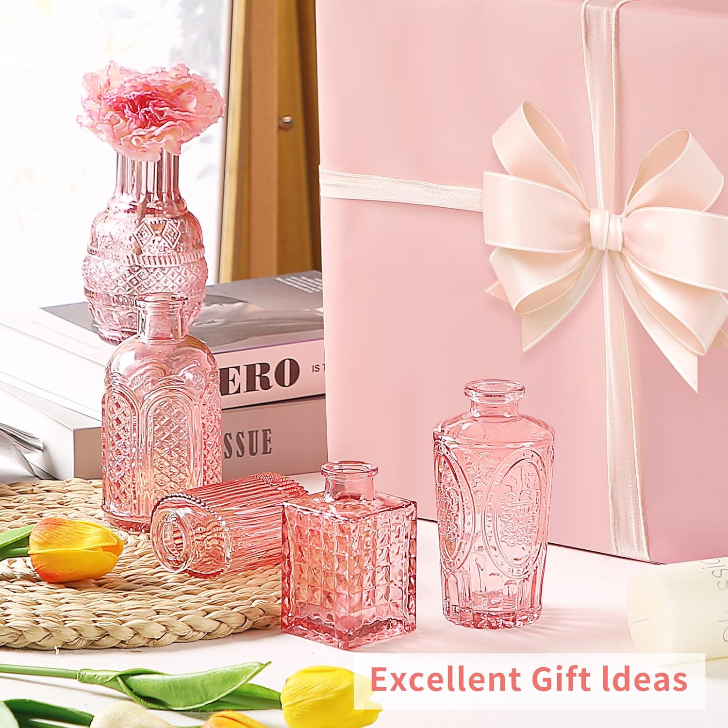 • Elegance Redefined: These mini glass vases in pink serve as perfect vessels for real or artificial flowers. Each small pink vase accommodates a single short stem or two petite flowers, presenting a sophisticated and graceful appearance even when displayed individually. Their delicate shapes and intricate patterns make for captivating décor accents, even without floral arrangements.