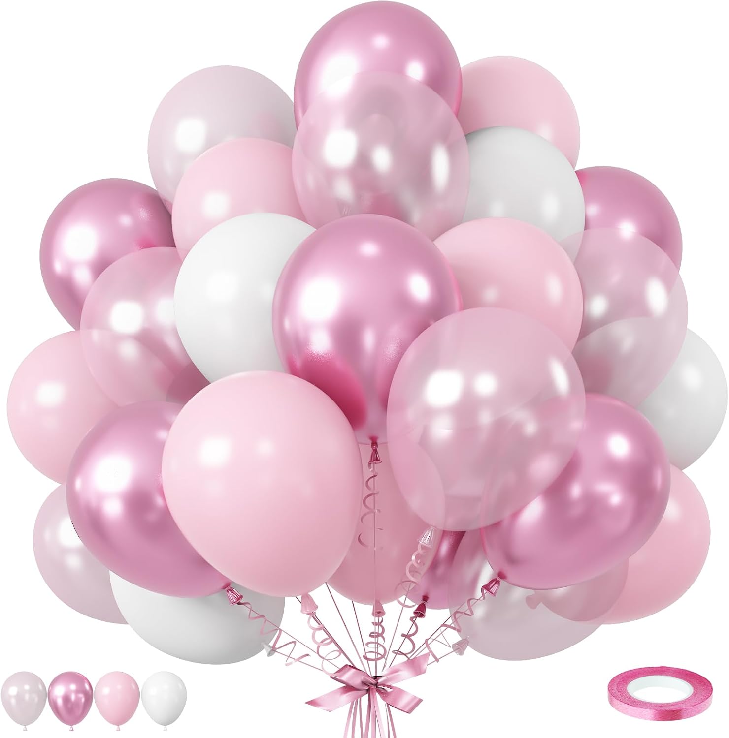 Pink Balloon Set - 12 Inch Metallic, Light Pink and White Latex, Pastel Macaron Pink Party Decoration for Girl Women Birthday, Wedding, Baby Shower, Valentine's Day
