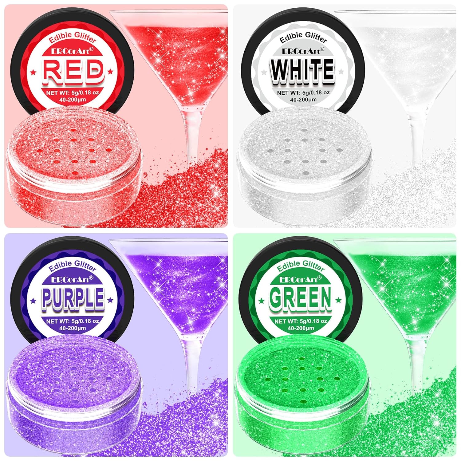 • LUXURY CAKE DUST - Fine texture dust powder with shimmer glitter, this elegant edible glitter helps to create high luster/glitter effect and adding a vibrant metallic finish to your project. Come with 4 colors to choose: red, purple, white, green. All cocktail glitter looks amazing and beatiful!