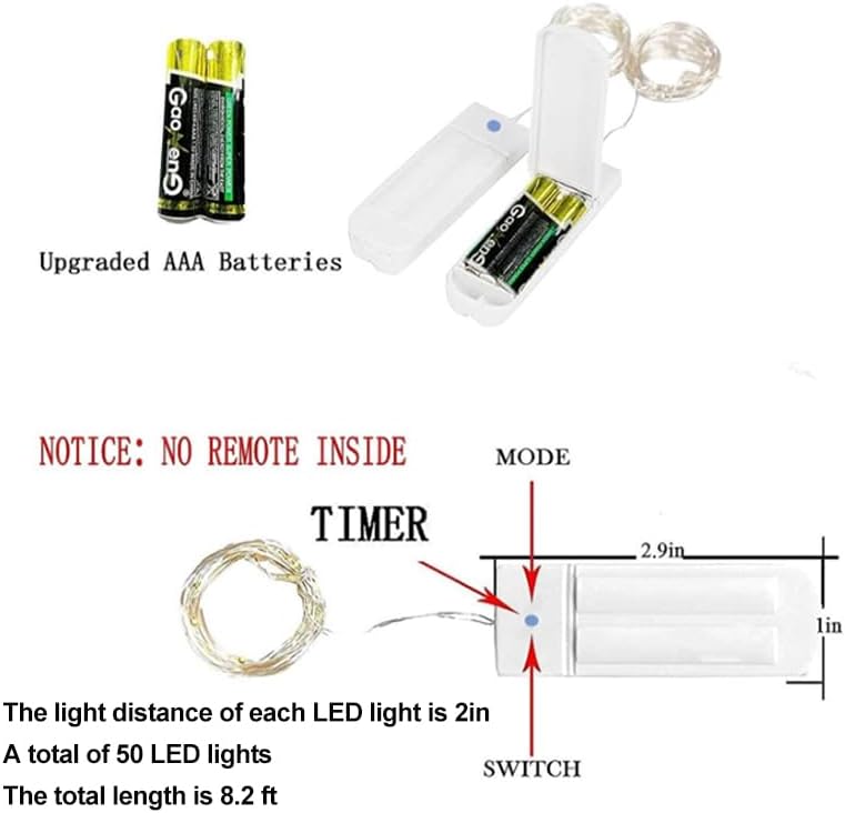 • 【4 Pack Ultra-Bright LED Battery Powered Fairy Lights】4 packs of 50LED lights with a total wire length of 8.2 feet. Each fairy lights is composed of 50 super bright LED bulbs, each bulb spacing of 2 inches, emit 2700k warm white light, bring a warm romantic atmosphere to your bedroom, garden, its battery box size of 2.95*0.9 inches;