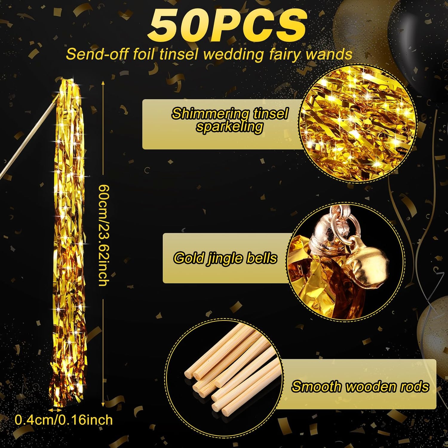 • Ideal Size: the size of the wedding wands is about 11.8 x 0.2 inches/ 30 x 0.5 cm for the stick and 23.6 x 0.2 inches/ 60 x 0.4 cm for the metallic foil; The stick is designed to be comfortably held in hands while the metallic foil is long enough for a dramatic and festive effect