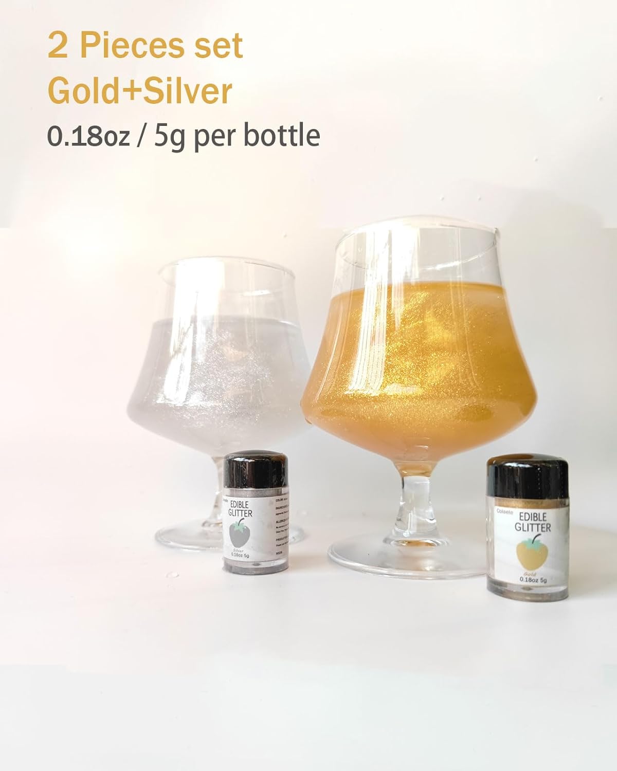 Gold Silver Edible Glitter Glimmer Powder for Cakes Drinks - Colaele 5 grams Food Grade Luster Dust Metallic Food Decorating Sprinkle Disco Brew Dust for Cake Decorations Wine Beverage Dessert, Vegan