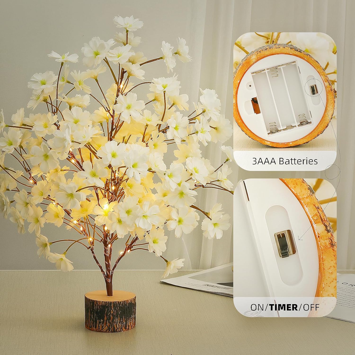 • Pre-lit blossom tree with timer: By placing the switch on the timer button, the artificial cherry blossom tree white will automatically turn off after 6 hours and then light up for 18 hours. The timer function saves battery power and extends battery life