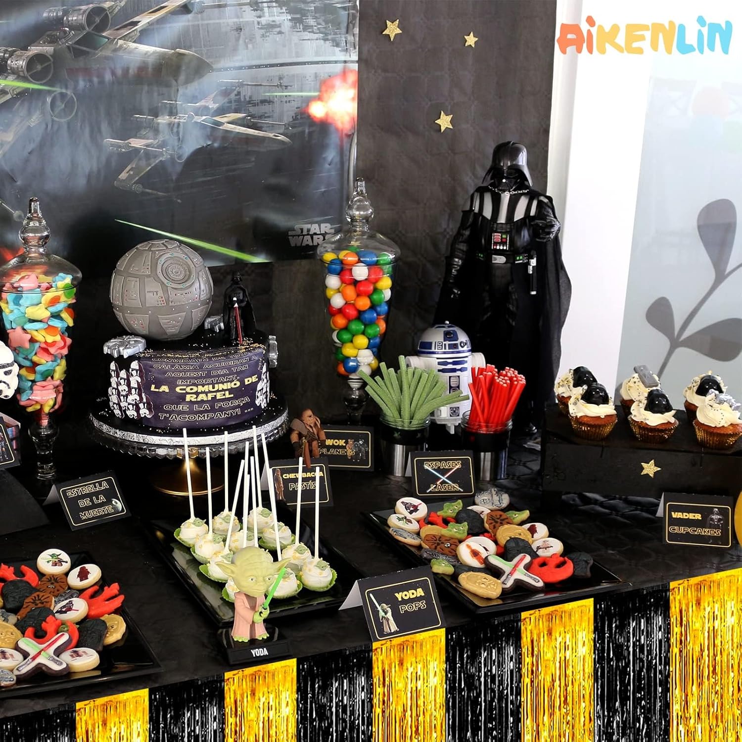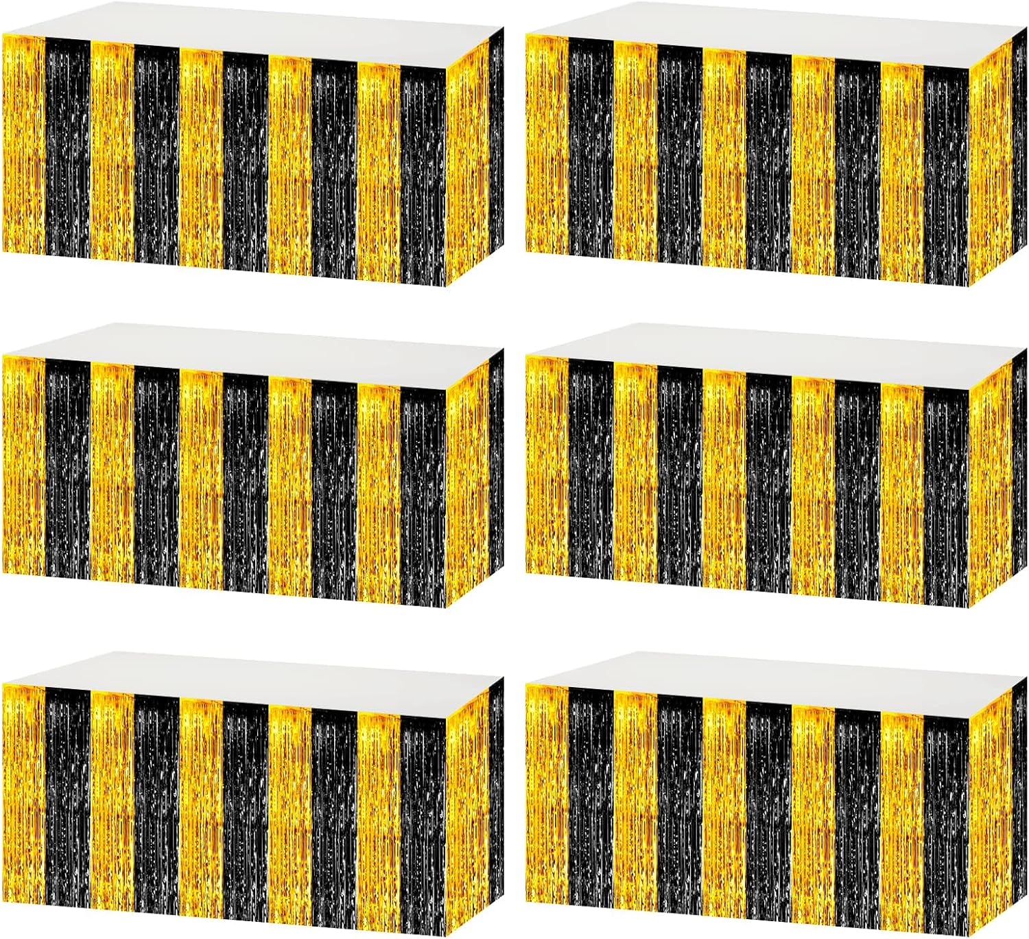 6 Pack 29x108 Inch Black Gold Metallic Foil Fringe Tinsel Table Skirts for Rectangle Tables Streamer Curtains Backdrop for Wedding, Parade Floats, Valentine's Day Birthday Graduation Party Decoration