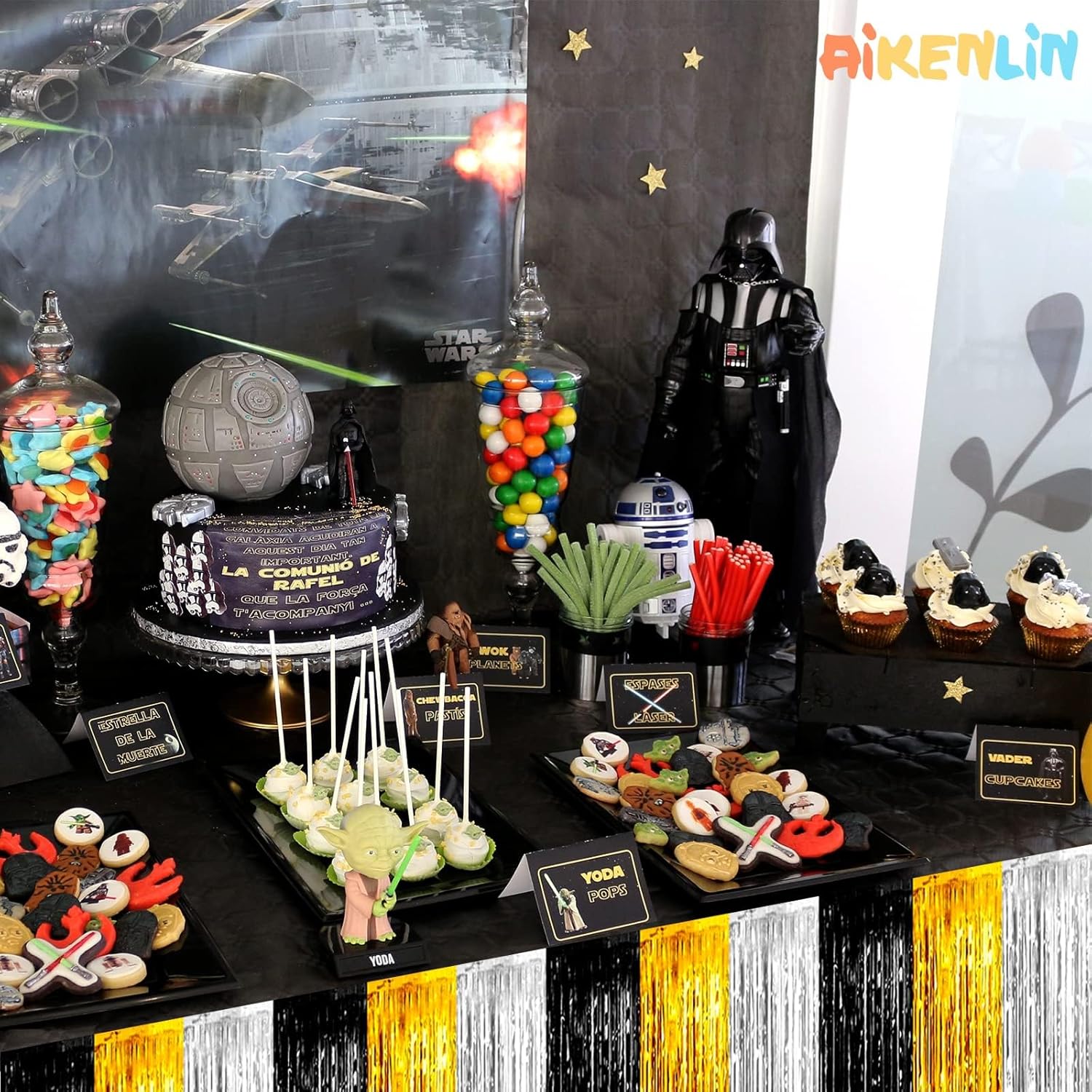 6 Pack 29x108 Inch Metallic Foil Fringe Tinsel Table Skirts Banner for Rectangle Tables Streamer Garland for Birthday, Parade Floats, Valentine's Day Party Decoration(Black Gold Silver)