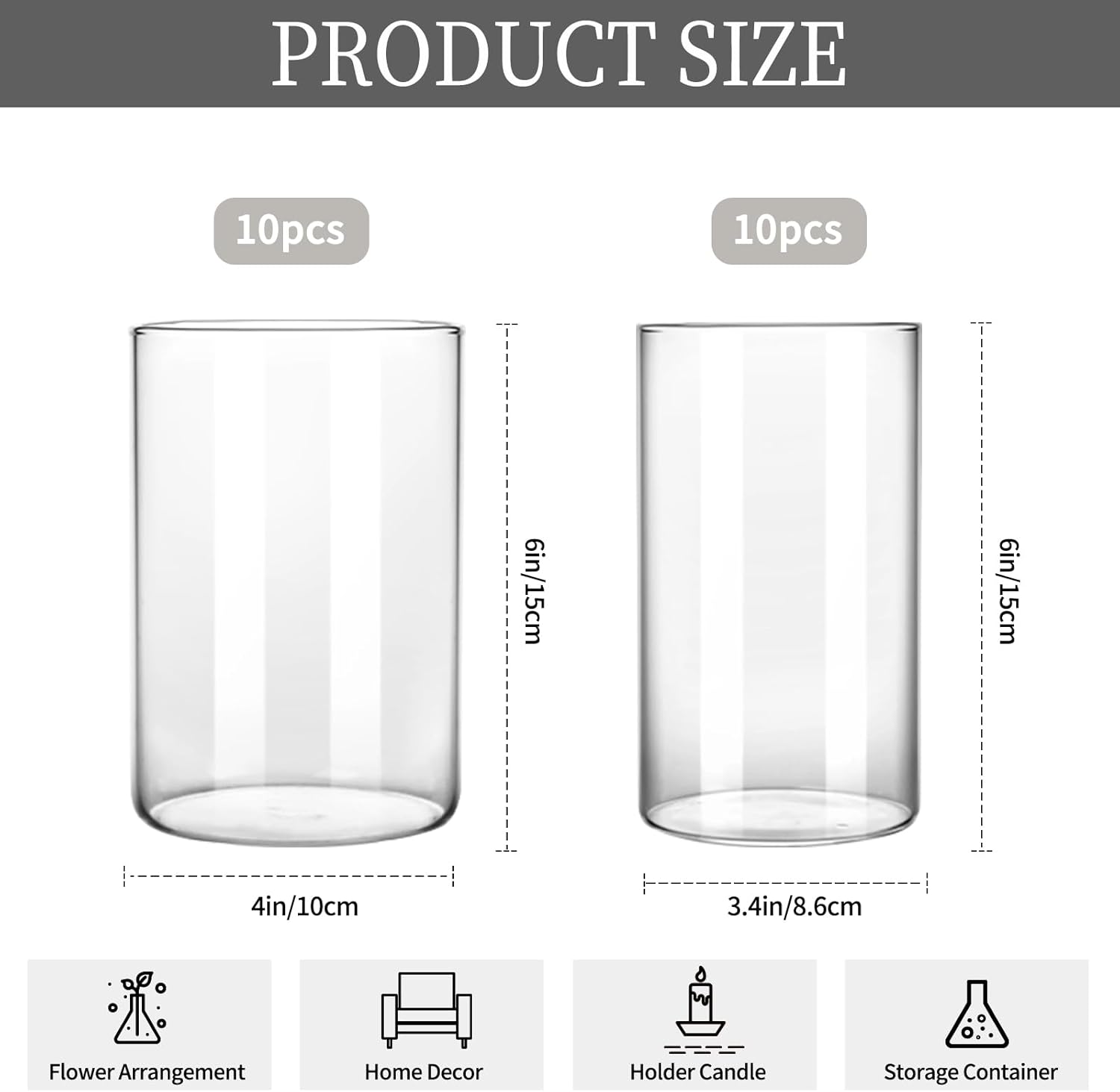 • Package contains: The set contains 20 glass cylinder vases, 10 pack 6" height & 4" bottom diameters, and 10 pack 6" height & 3.4" bottom diameters. The 3.4-inch glass vase can perfectly match your 3-inch candle, and the 4-inch glass vase can be used for flower arrangements. The combination can meet your different needs.
