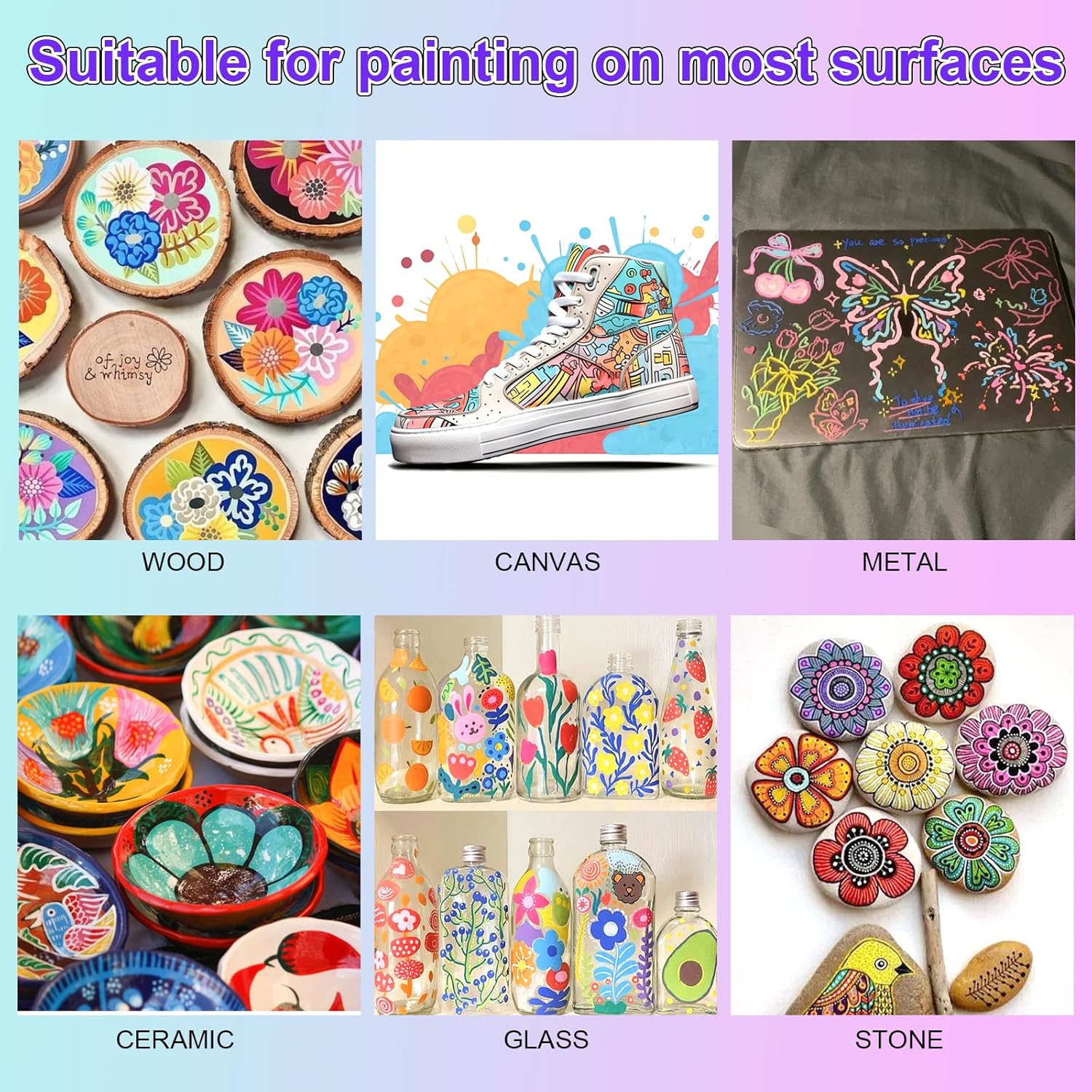 • 【Widely Used】Acrylic paint pens have the characteristics of strong coverage,quick drying,and smoothness, making them suitable for various surfaces.such as canvas,wood,metal, rock painting,glasses,plastic,paper,ceramics,and more.