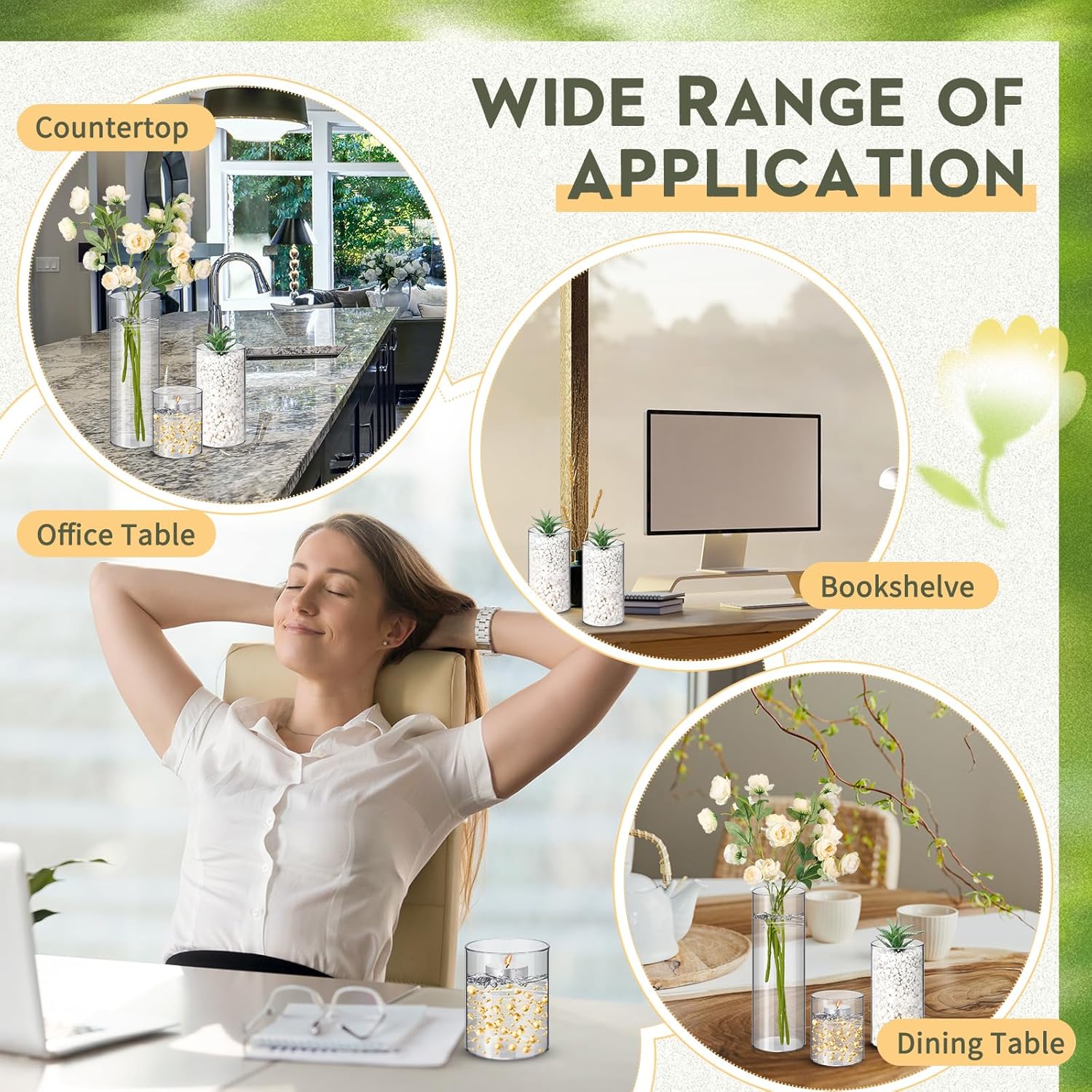 • Transparent Cylinder Design: the clear and transparent design of these wide vases allows for a beautiful and unobstructed view of the contents within, enhancing the visual appeal of your floral arrangements or candle displays; The sleek cylindrical shape adds a modern touch to any setting, making it an ideal choice for both casual and formal occasions