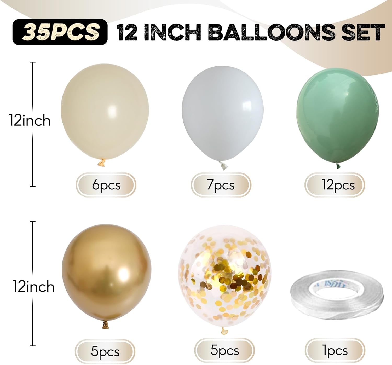 • Sage Green Gold Balloons Set: 35pcs 12 inch sage green party decorations latex balloons, include 12pcs sage green balloons, 7pcs beige balloons, 6pcs sand white balloons, 5pcs metallic gold balloons, 5pcs gold confetti balloons and 1pc ribbon