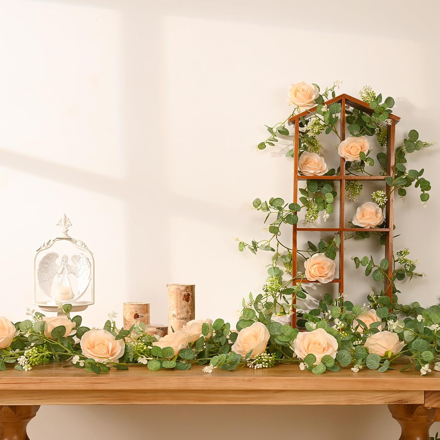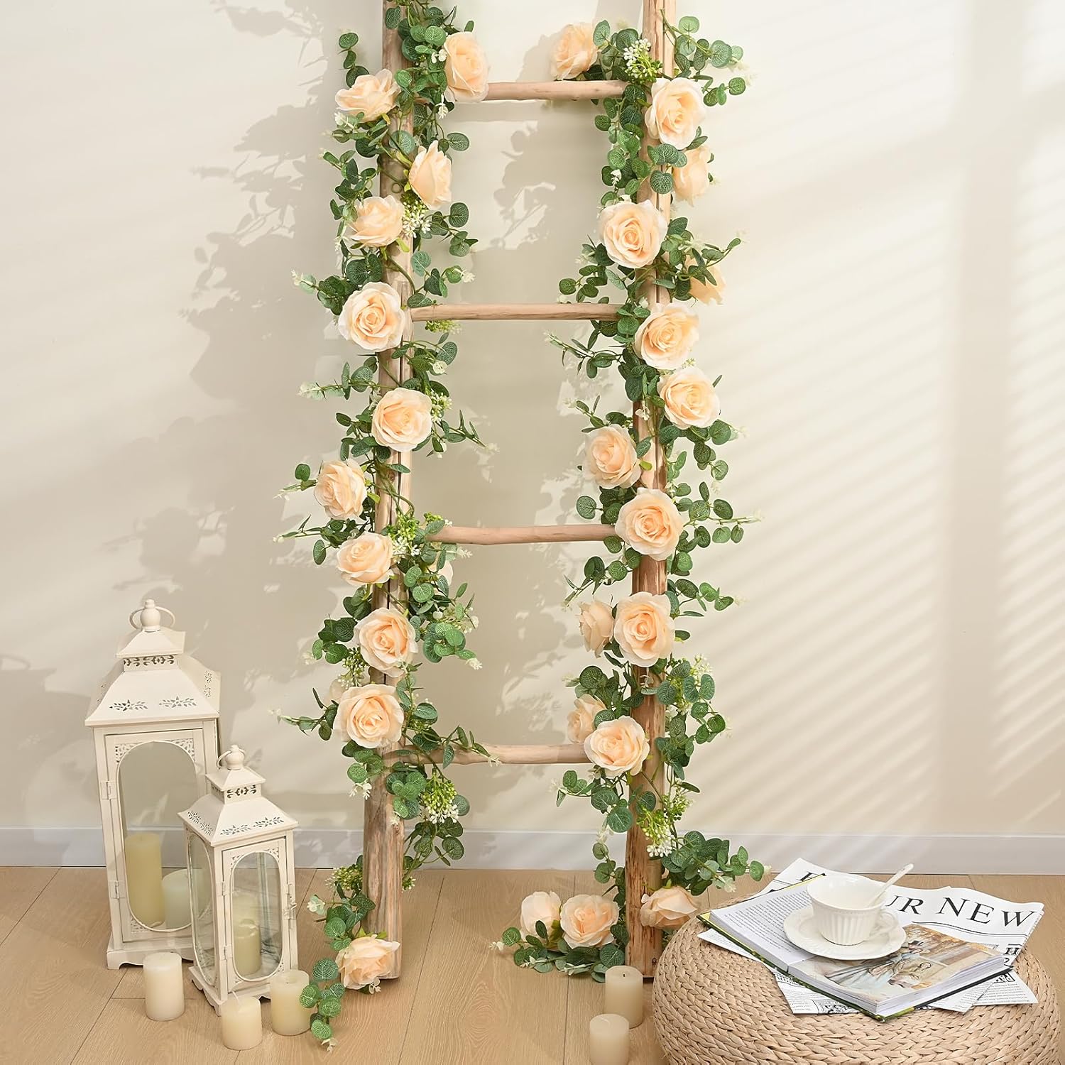 • 🌹PACKAGE INCLUDES: The package includes 4 Pcs artificial eucalyptus garland with flowers. Each piece of flower vine is 6.5Ft/2M long and decorated with 8 champagne roses, eucalyptus leaves and seeds. There are also many small plastic rings distributed on the vine for easy hanging. You can easily trim or bend the shape according to your own preferences and decorative needs.