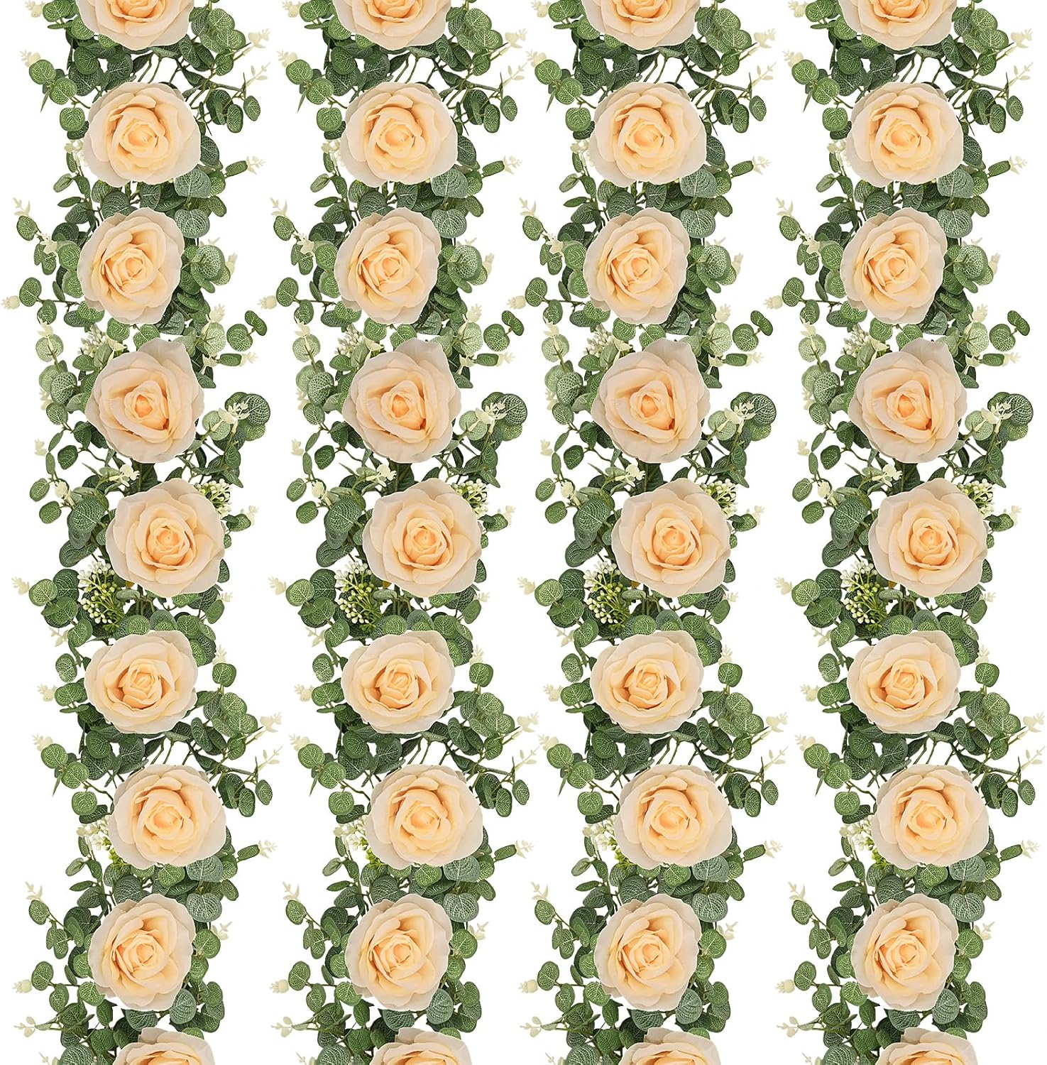 Dolicer 4Pcs 26Ft Artificial Eucalyptus Garlands with Flowers - 8 Roses, Faux Floral Greenery Garlands Fake Flowers Vines for Wedding Table Centerpieces Arch Party Ceremony Backdrop Decor (Champagne)