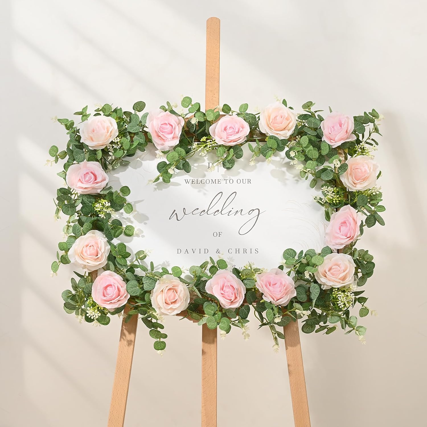 • 🌹PACKAGE INCLUDES: The package includes 2 Pcs artificial eucalyptus garland with flowers. Each piece of flower vine is 6.5Ft/2M long and decorated with 8 pink & blush roses, eucalyptus leaves and seeds. There are also many small plastic rings distributed on the vine for easy hanging. You can easily trim or bend the shape according to your own preferences and decorative needs.