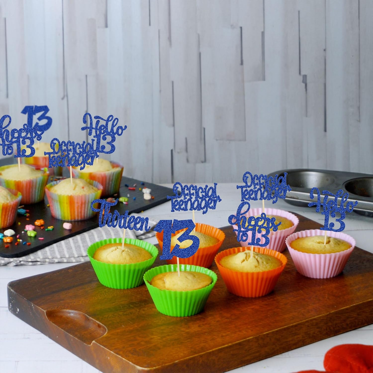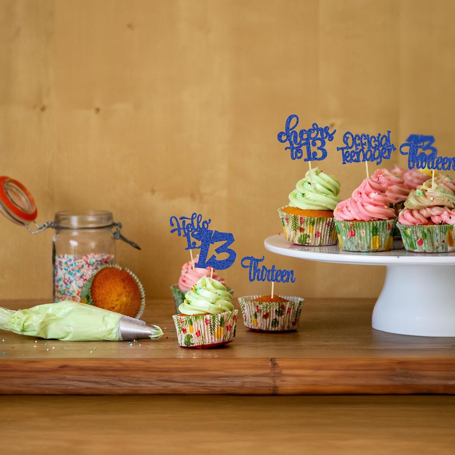 30Pcs 13th Birthday Cupcake Toppers Hello 13 Cupcake Picks Official Teenager Cheers to 13 Years Old Cake Decorations for 13th Birthday Anniversary Party Supplies Deep Blue Glitter