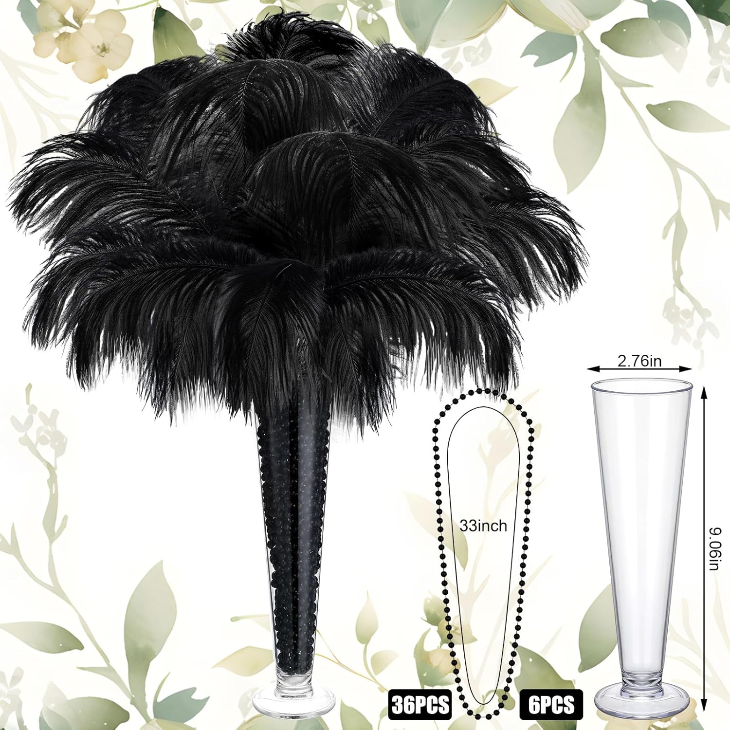 • Wedding Table Decoration Set: you will receive 54 black ostrich feathers for vases, 54 plastic hose sticks, 6 plastic vases, 9 rolls of black tape, 36 black beaded necklaces in bulk; Sufficient quantity for rich combinations, easily meet your wedding party, home decoration needs and DIY craft needs; You can also share it with your friends and family