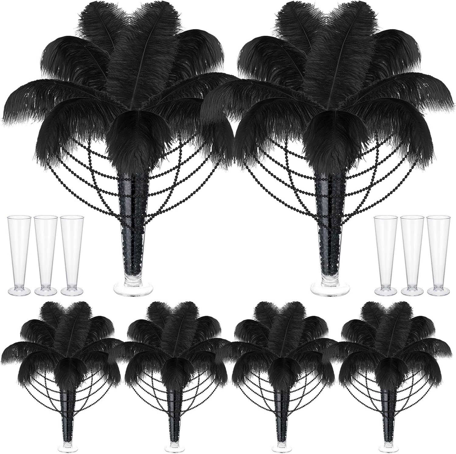 Yuxung 6 Sets Wedding Table Centerpiece Accessories Including 159 Pieces Natural Ostrich Feather Bulk Plastic Vases and Beads Necklaces for Wedding Home Party Centerpiece Supplies(Black)