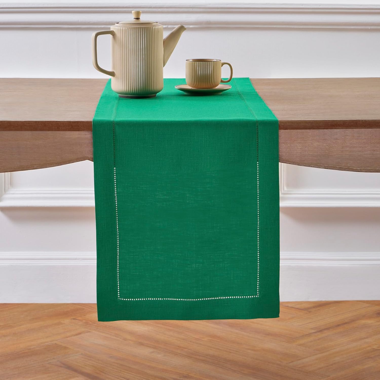Solino Home Linen Hemstitch Table Runner 120 Inches Long - 100% Pure Linen Emerald Green Table Runner 14 x 120 Inch for Christmas - Classic Hemstitch