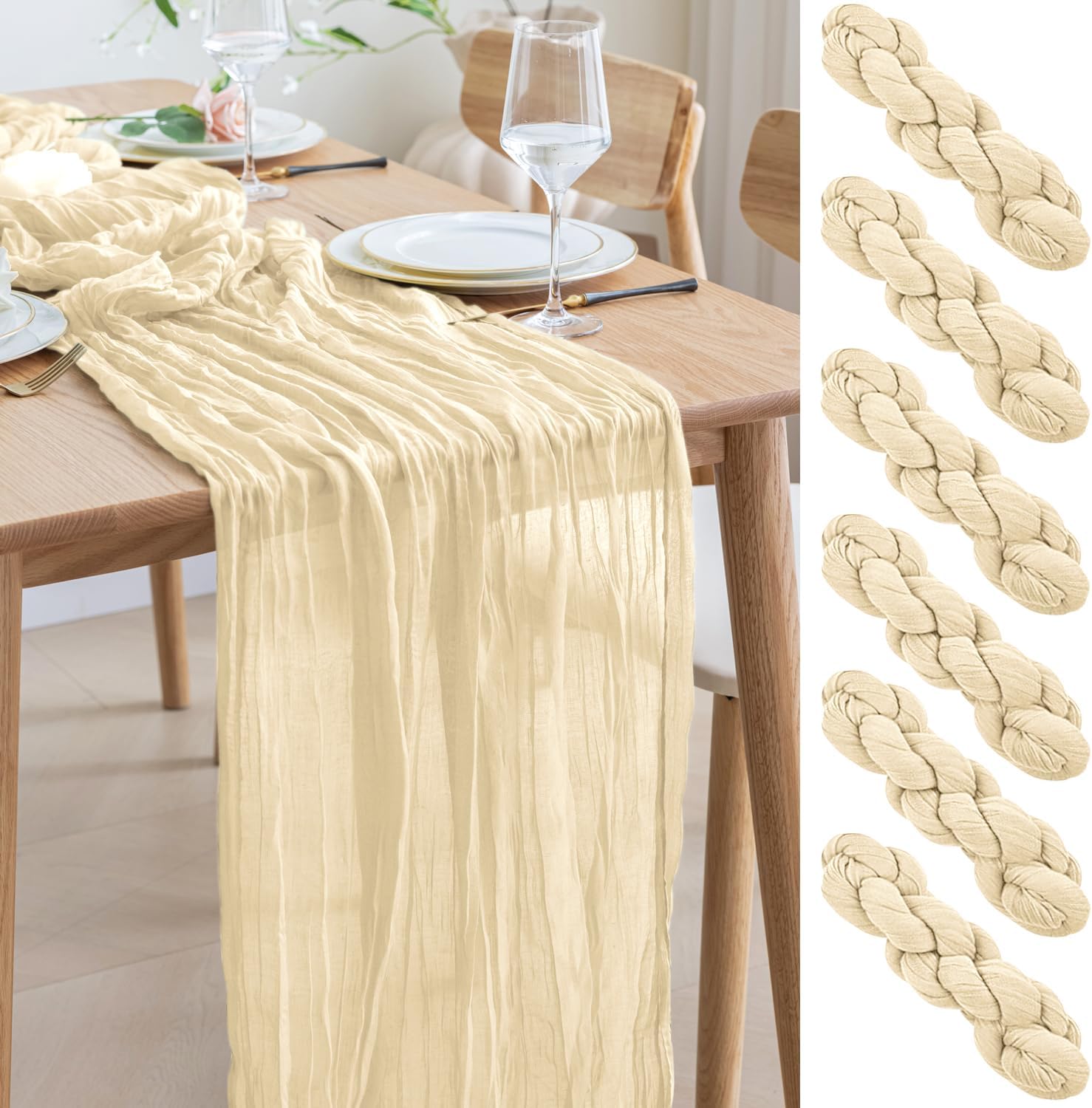 Asee'm 6pcs Cheesecloth Table Runner 120 Inches Long Beige Boho Gauze Cheese Cloth Runner 10FT Rustic Sheer Table Runners for Christmas Wedding Party Baby Shower Spring Easter Decoration