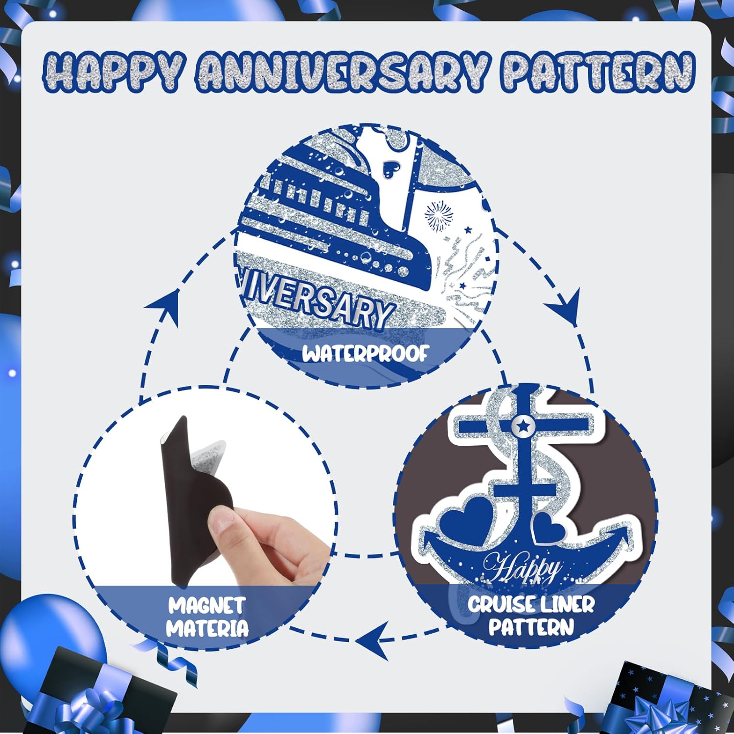 • 💌Cruise Door Magnets Decorations:You will get 16pcs of Blue Silver Happy Anniversary Cruise Door Magnets.These Happy Anniversary Cruise Door Magnets have "Happy Anniversary Cruise" and many shapes.With these beautiful happy anniversary magnets decorations, they further set off a atmosphere of your anniversary party.