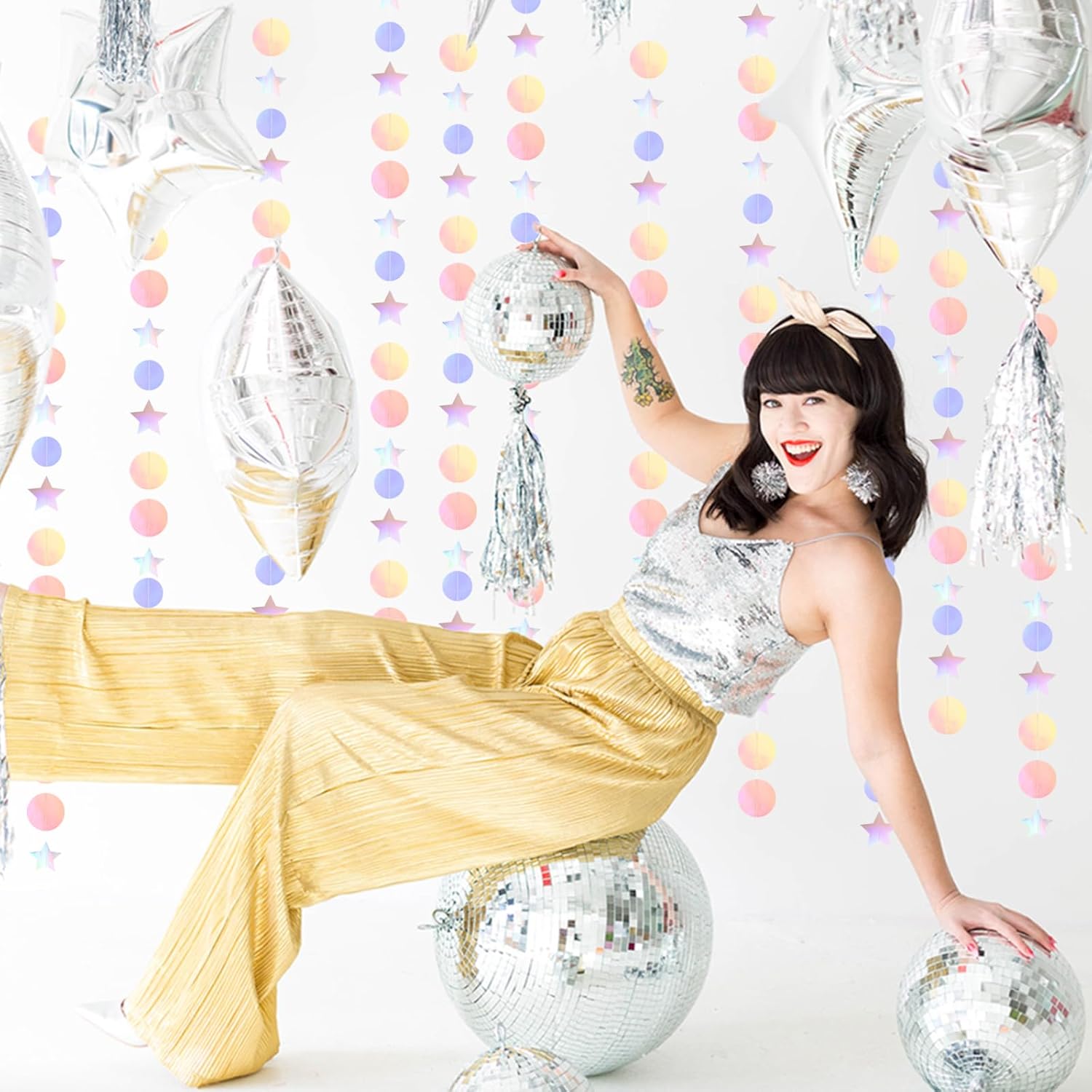 Iridescent Disco-Holographic Birthday Party-Decorations Garland - 52Ft Star Neon Wedding Hanging Paper Streamers Banner,Christmas Bachelorette Baby Bridal Shower Engagement Decor Ouruola