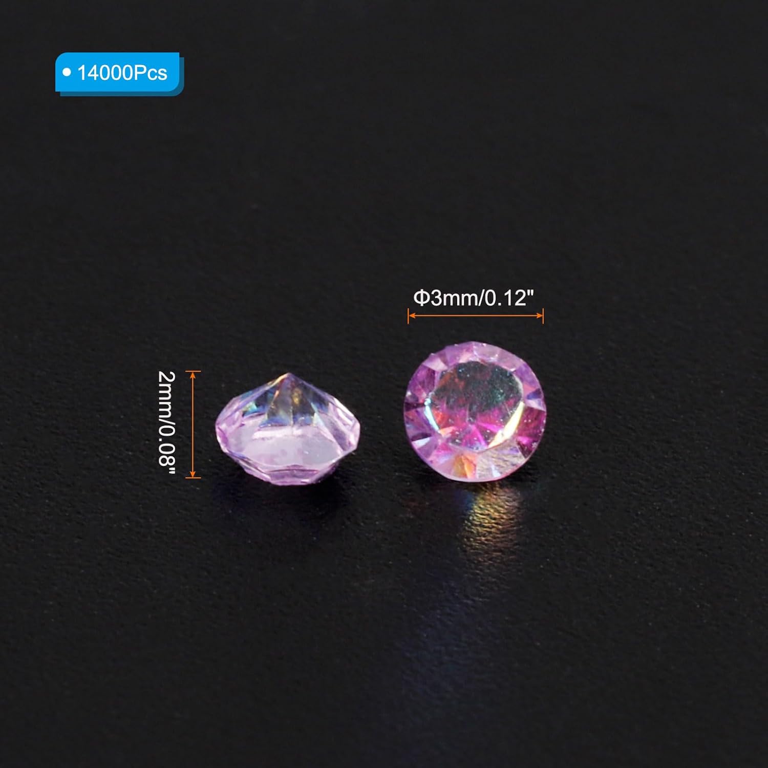 • Color: Light Purple AB; Material: Acrylic; Size: 3mm x 2mm/ 0.12 x 0.08 inch (Dia.x H); Packing List: 14000Pcs x Acrylic crystal diamonds