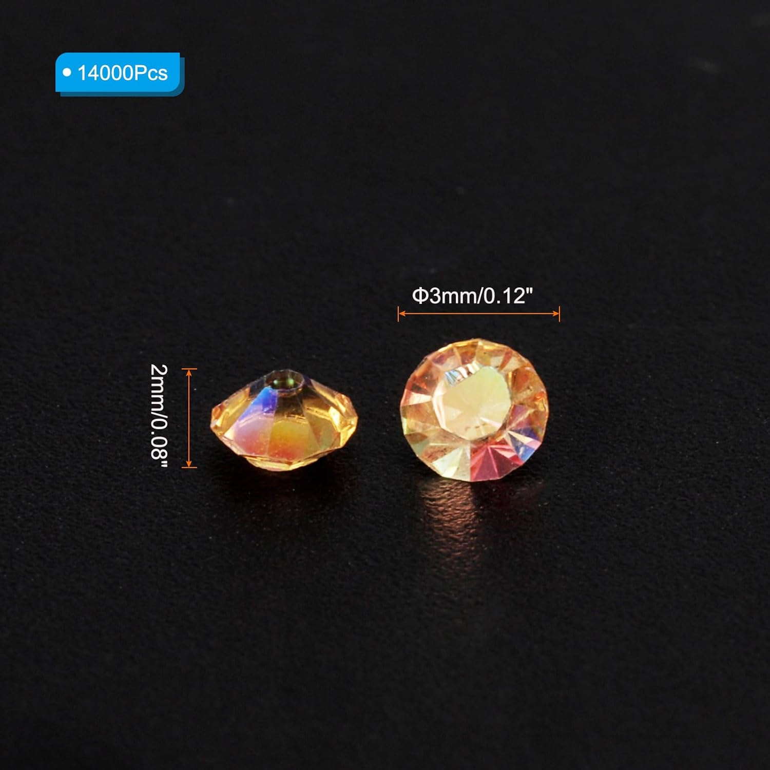 • Color: Yellow AB; Material: Acrylic; Size: 3mm x 2mm/ 0.12 x 0.08 inch (Dia.x H); Packing List: 14000Pcs x Acrylic crystal diamonds
