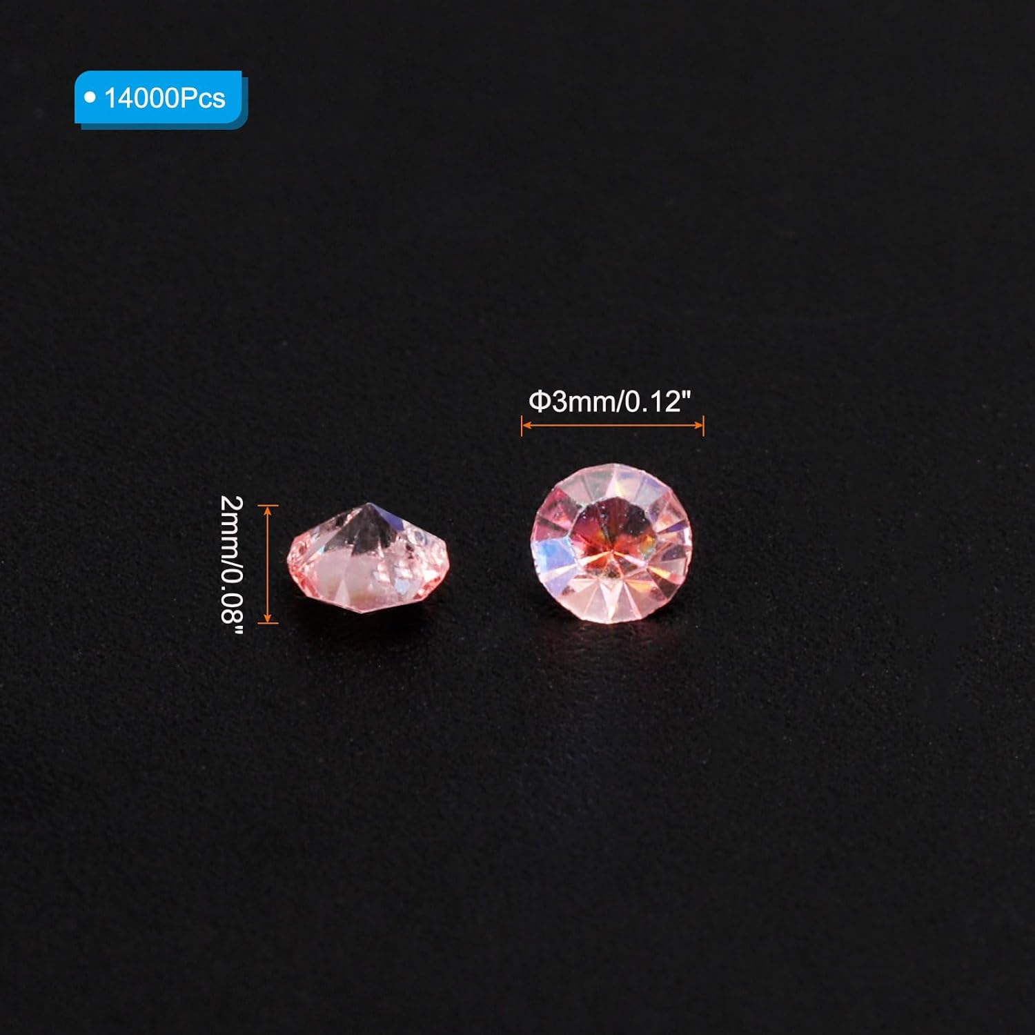 • Color: Pink AB; Material: Acrylic; Size: 3mm x 2mm/ 0.12 x 0.08 inch (Dia.x H); Packing List: 14000Pcs x Acrylic crystal diamonds