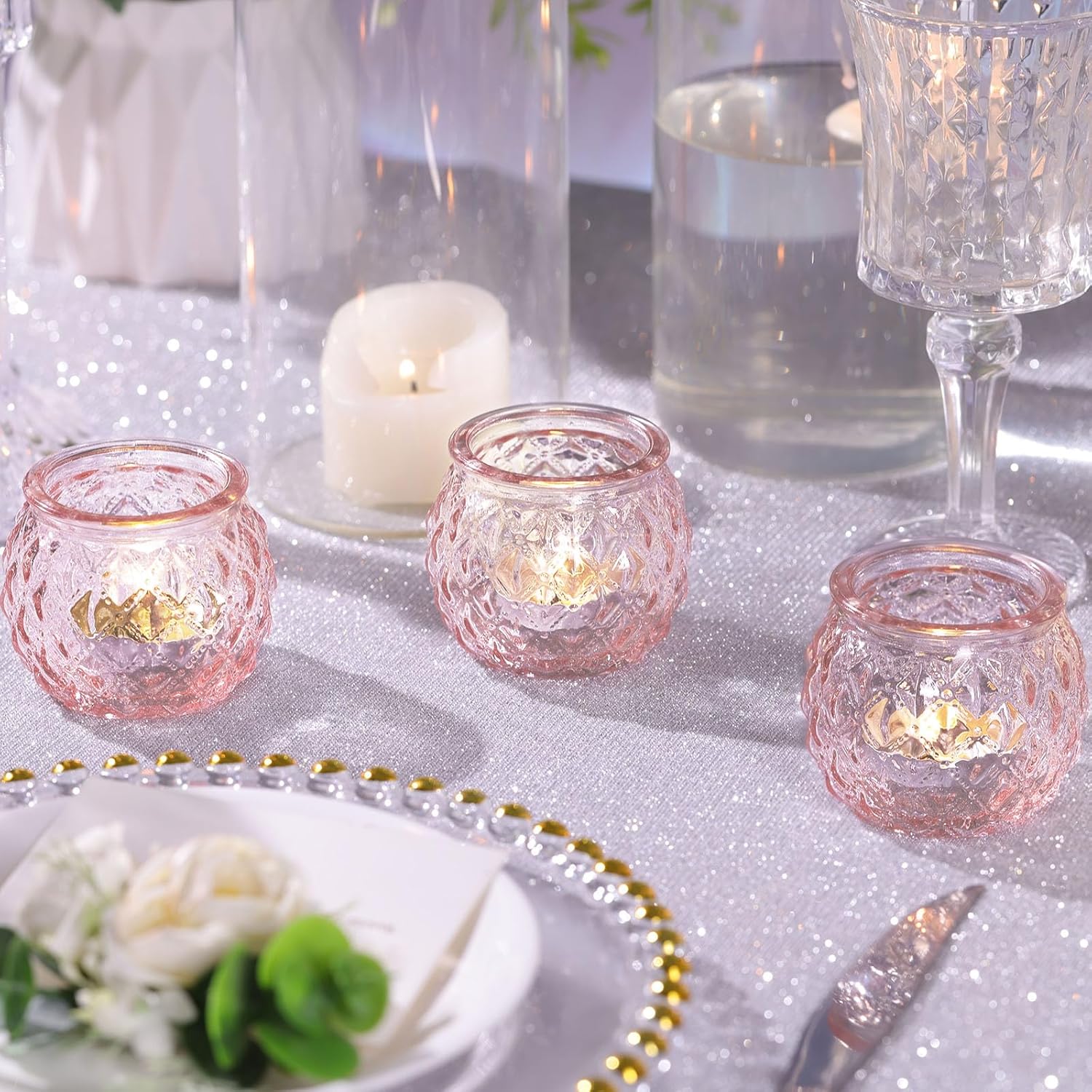DARJEN 12Pcs Pink Votive Candle Holders - Round Glass Candle Holders for Flameless LED Tea Waxes, Romantic Candle Holder for Wedding & Home Table Decor, Various Parties