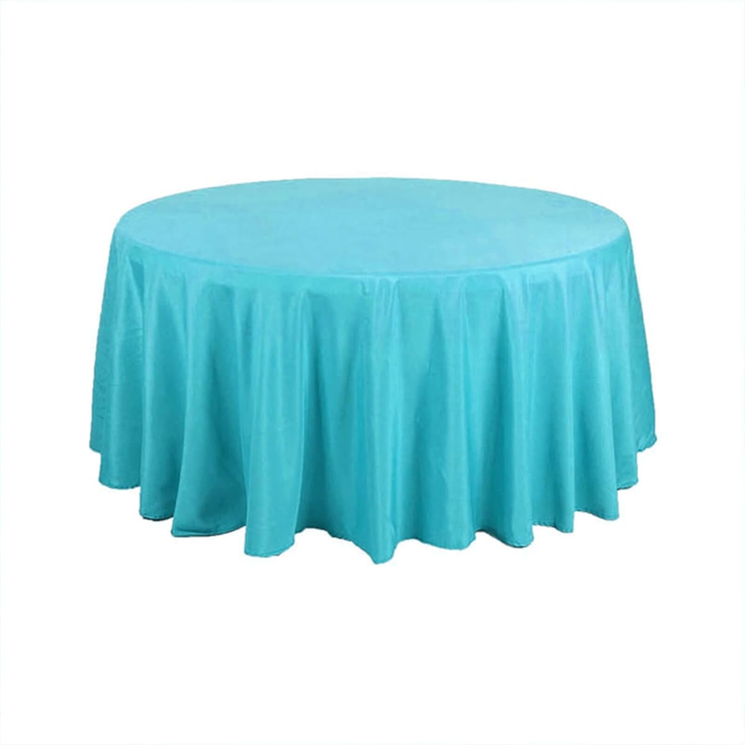 • Quantity: 1 Round Tablecloth Material: 100% Polyester Color: Turquoise Size: 120" Round Thickness: 130 GSM Stain & Wrinkle Resistant, Machine Washable Hemmed edges for an exquisite look. 1 piece, seamless design Gives floor length hang on standard 5ft (60") tables