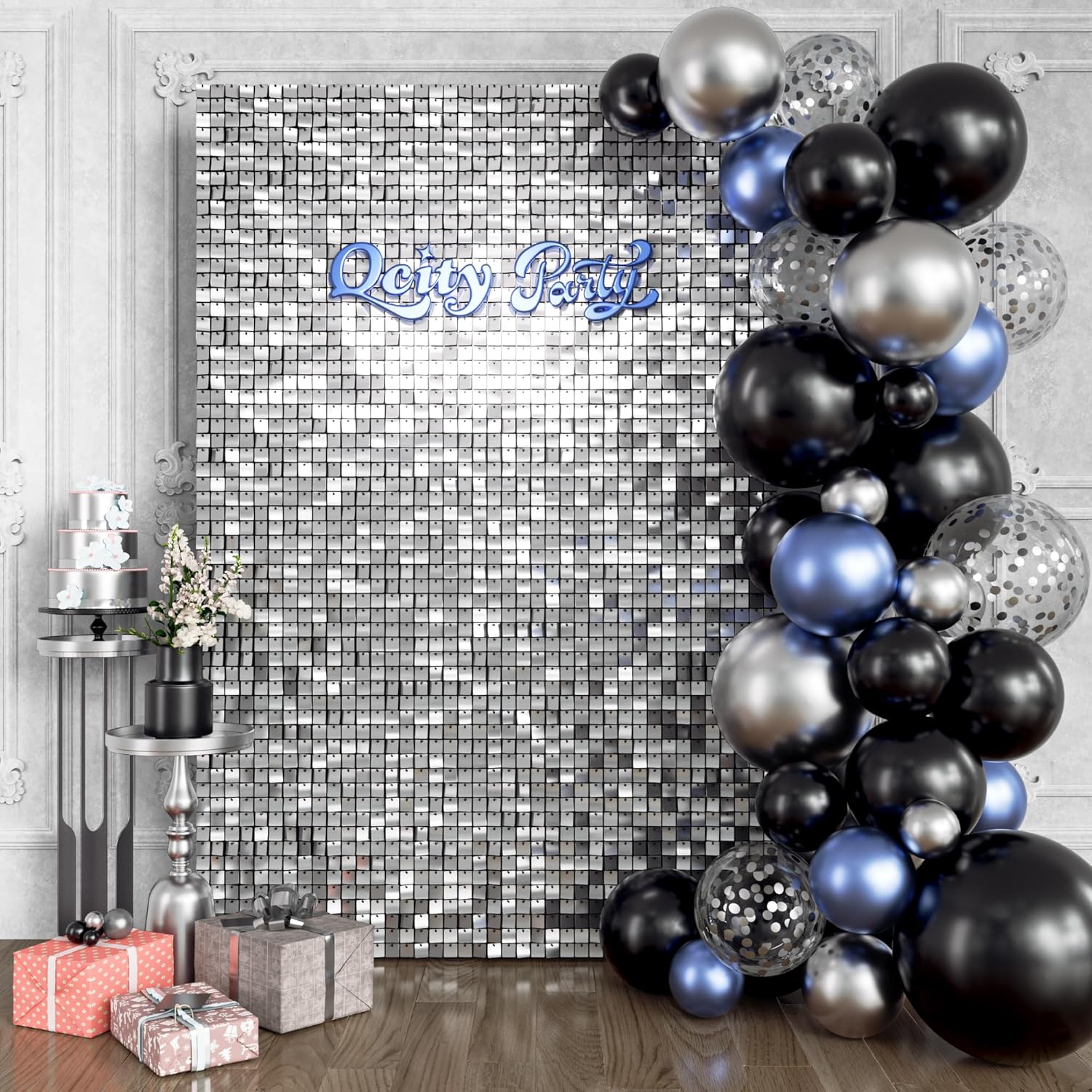 Qcity Silver Shimmer Wall Backdrop 24PCS, Black Back Not See-Through Design, Square Sequin Glitter Backdrop Panel, Perfect for Outdoor Events, Birthdays, Wedding and Party Decoration