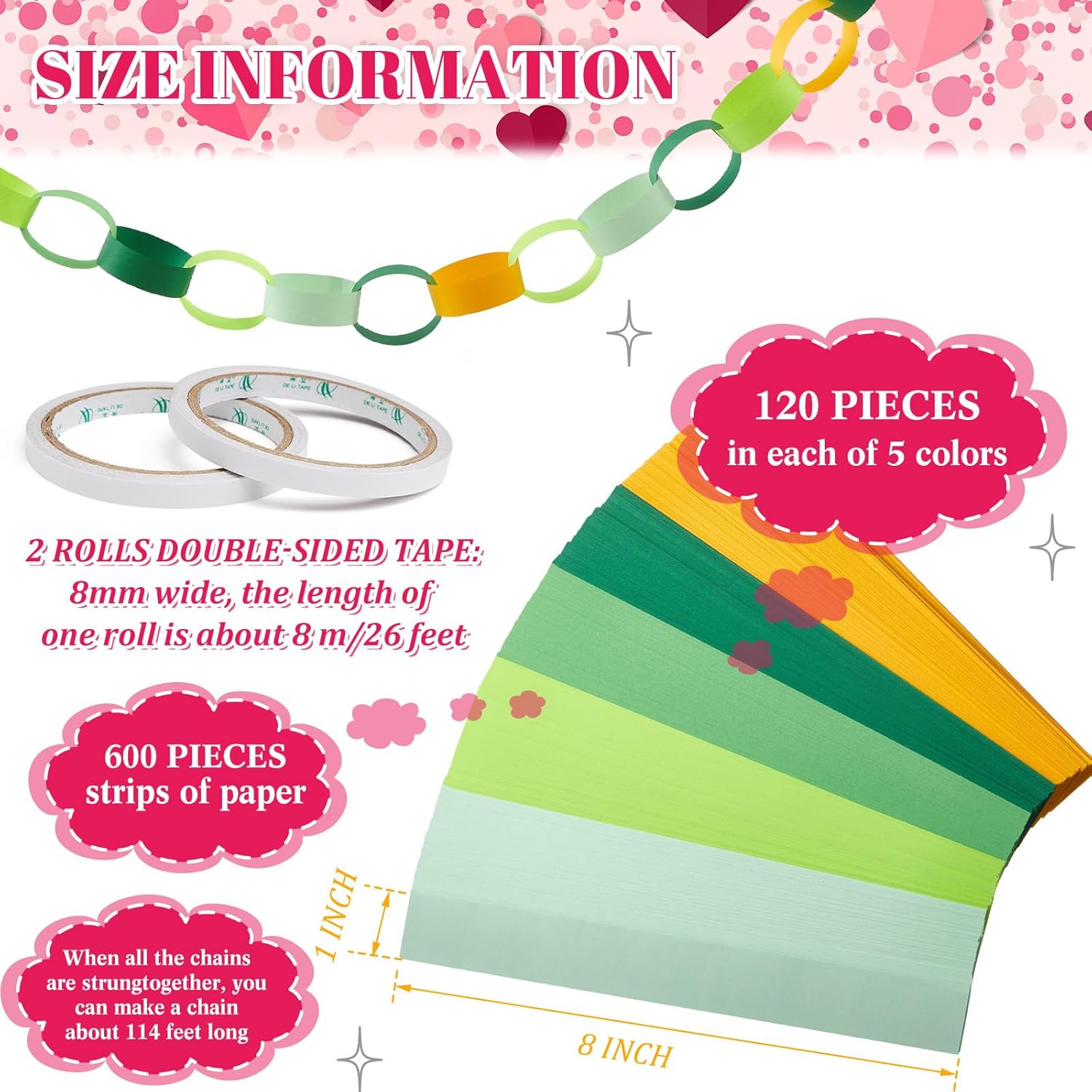 • Abundantly Colorful Paper Strips: the color palette is bountiful with our 600 sheets paper chain strips, equipped with 2 rolls of double sided tapes; The abundant quantity means you can create a paper chain that can stretch up to 28 feet in total length; The multitude of colors available broadens your design spectrum, bringing out ingenuity and creativity