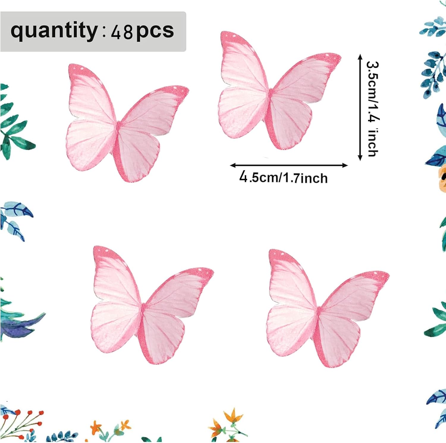 • Package:Our edible butterfly cake decorations comes with 48pcs package with a box . It's much convenient to storage and can be gift. Wing spans vary is 1.4 * 1.7 inches,thickness about 0.06 cm /0.024 inches