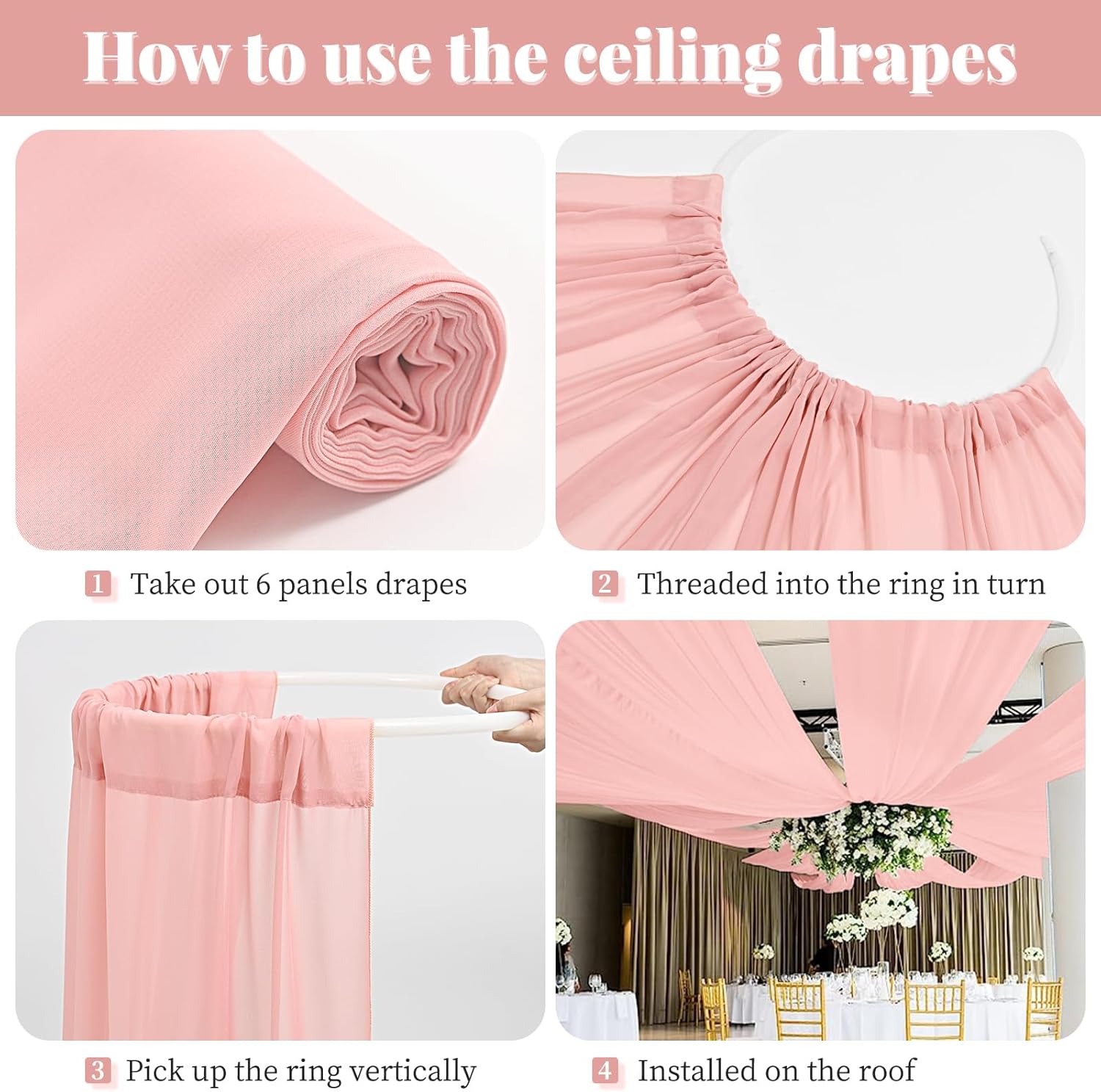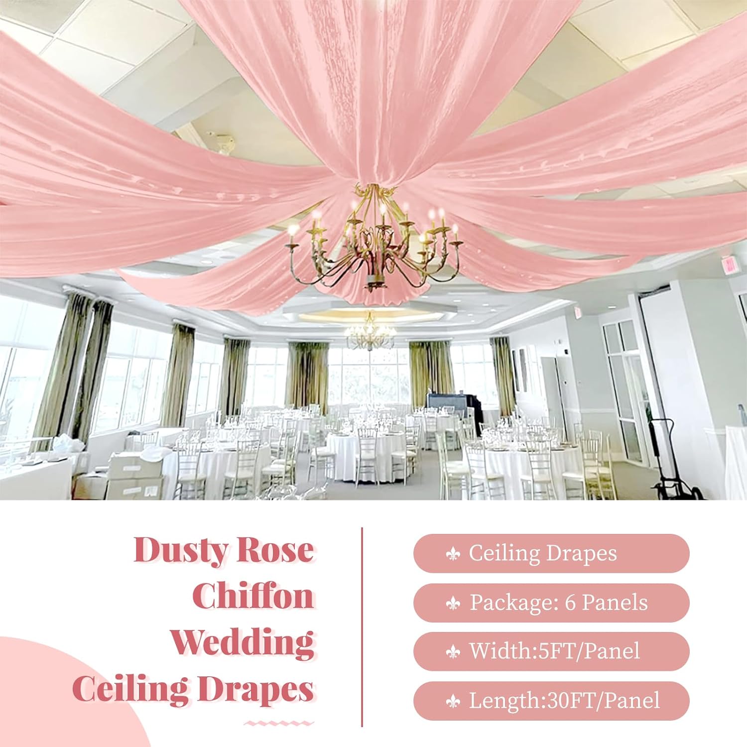 • 🌺Chiffon Ceiling Drapes: The package include 6 panels dusty rose wedding ceiling drapes (without hanging pieces). Each wedding long curtain measure for 5 feet width x 30 feet length. The sufficient quantity can meet your demands for decorating your weddings, parties, receptions. It will help to create a delicate and aesthetic sense to your wedding ceiling decoration.