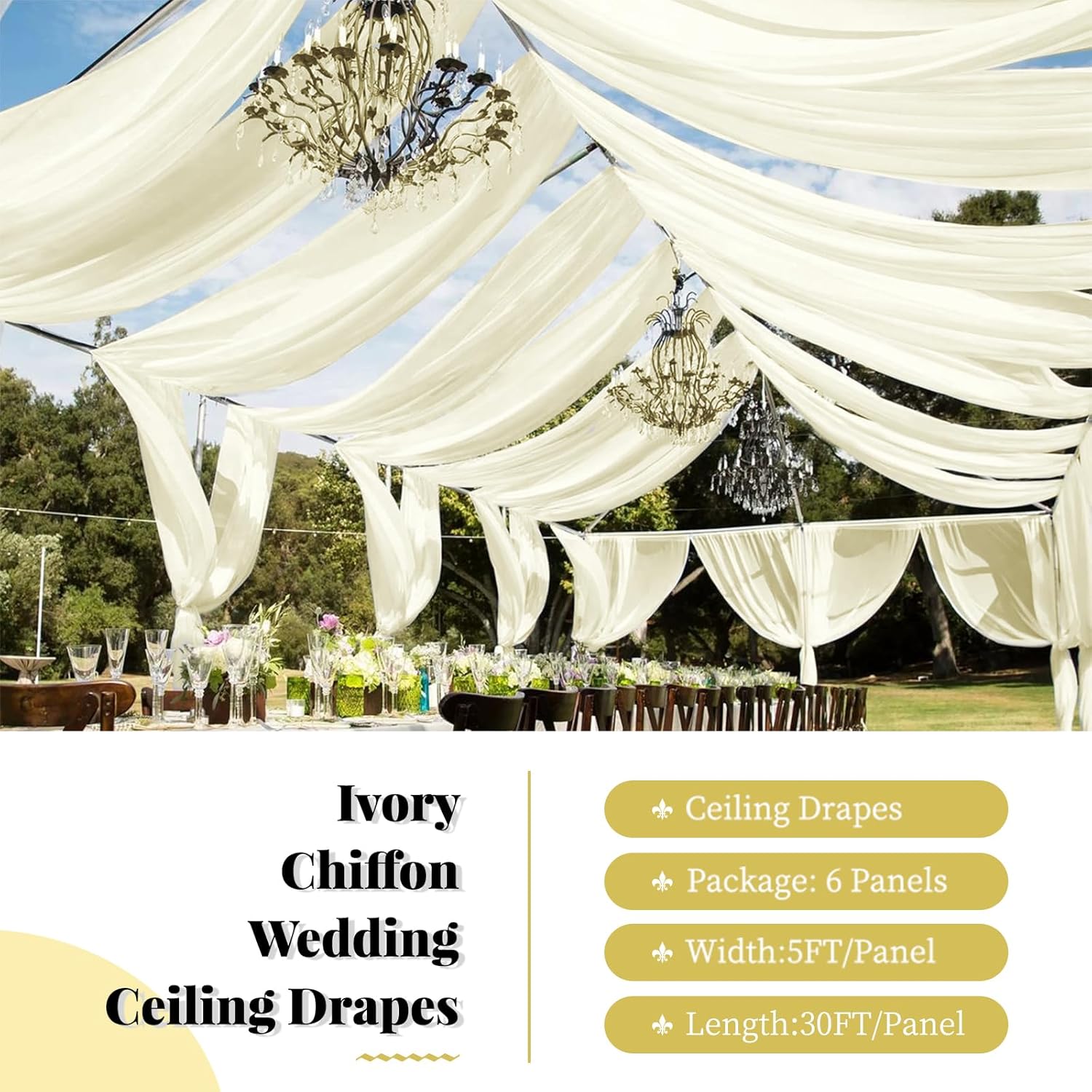 • 🍸Chiffon Ceiling Drapes: The package include 6 panels ivory wedding ceiling drapes (without hanging pieces). Each wedding extra long curtain measure for 5 feet width x 30 feet length. The sufficient quantity can meet your demands for decorating your weddings, parties, receptions. It will help to create a delicate and aesthetic sense to your wedding ceiling decoration.