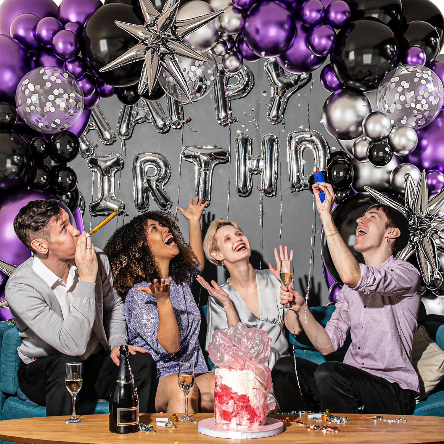 • [PACKAGE SPECIFICATION]127Pcs balloon arch kit includes silver starburst balloons(22in3pcs)+metallic purple balloons(18in2pcs+10in30pcs+5in15pcs)+black balloons(18in1+10in25pcs+5in15pcs)+metallic silver balloons(18in1pcs+10in15pcs+5in15pcs)+silver confetti balloons(12in5pcs),balloon glue dot,balloon decorating strip.