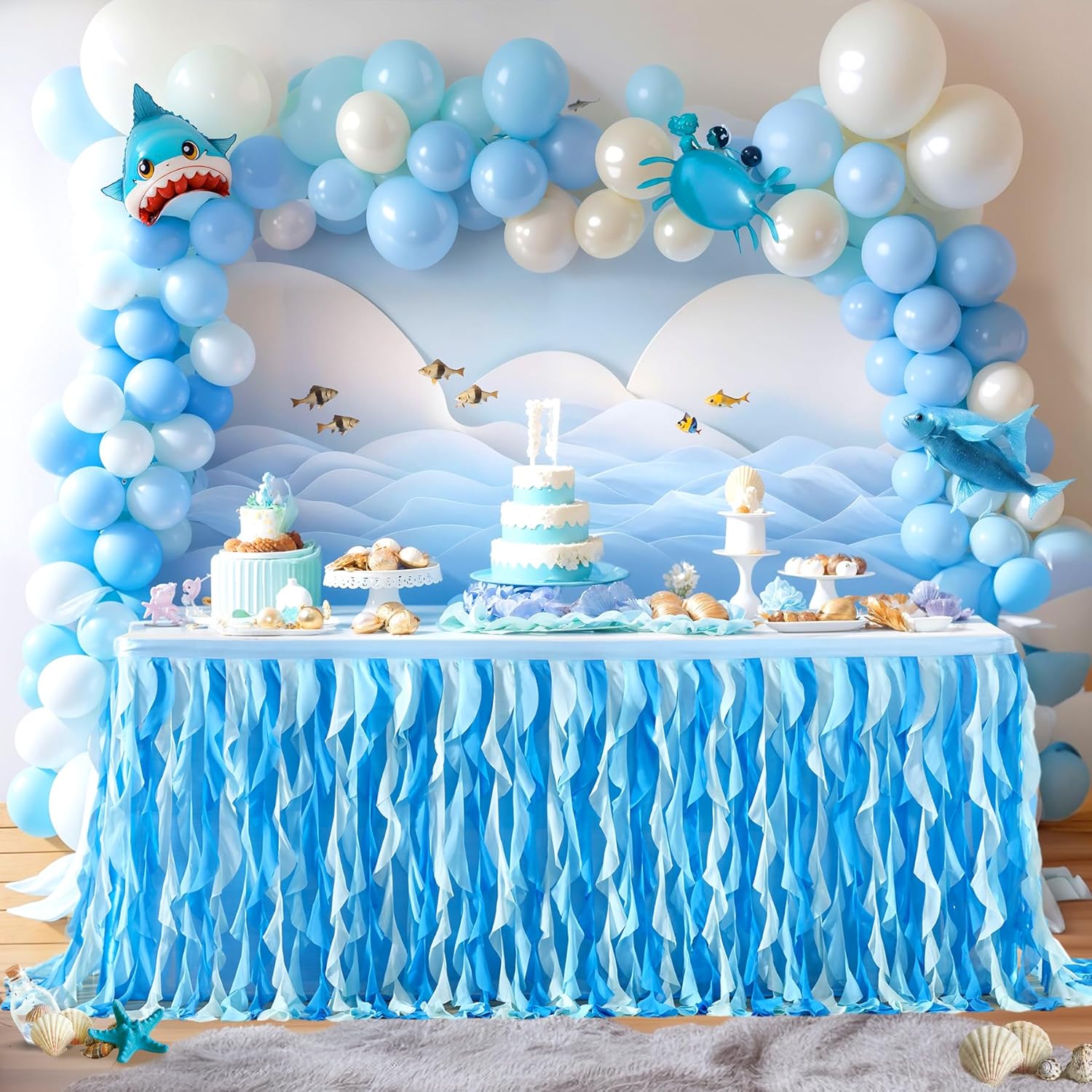 • Under The Sea Baby Shark Themed Table Skirt: Tulle curly willow table skirt perfect for girls or boys birthday party,baby shower,dessert table skirt,Ocean themed party,also good choice for candy table skirt or cake table skirt.