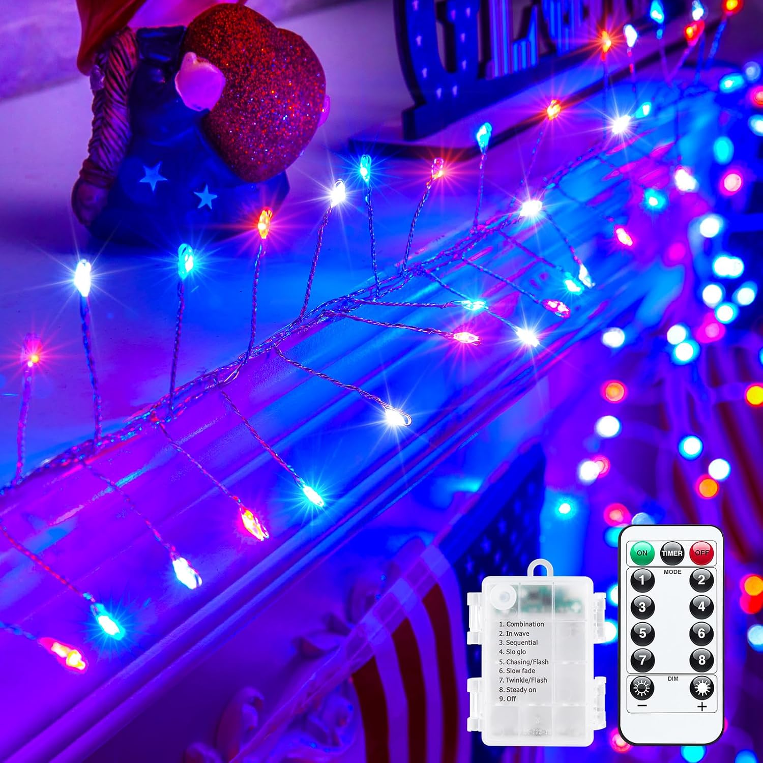 • Fairy Lights with Remote: These multifunctional patriotic string lights are super convenient, and enable us to switch eight flashing modes, and adjust the brightness quickly. Additionally, the timer function allows us to set up on/off time for 6hrs on/ 18hrs off. The twinkle lights will turn on automatically by settings, helping us to create a magic light show in the future.