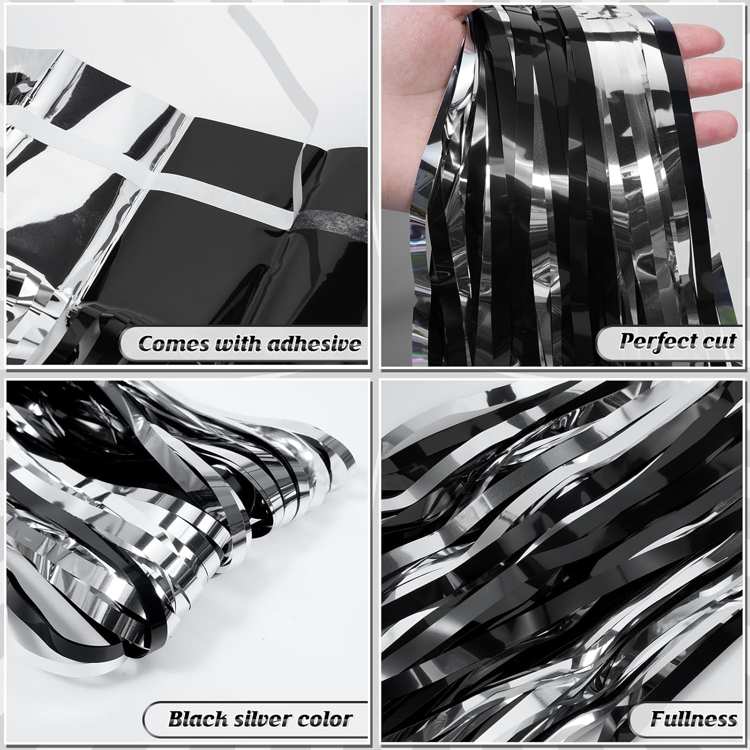 3 Pack 3.3Ft x 6.6Ft Graduation Foil Fringe Curtain Backdrop Decorations, Black Silver Metallic Tinsel Foil Streamers Curtain Photo Background for Graduation Prom Wedding Birthday Party Decorations