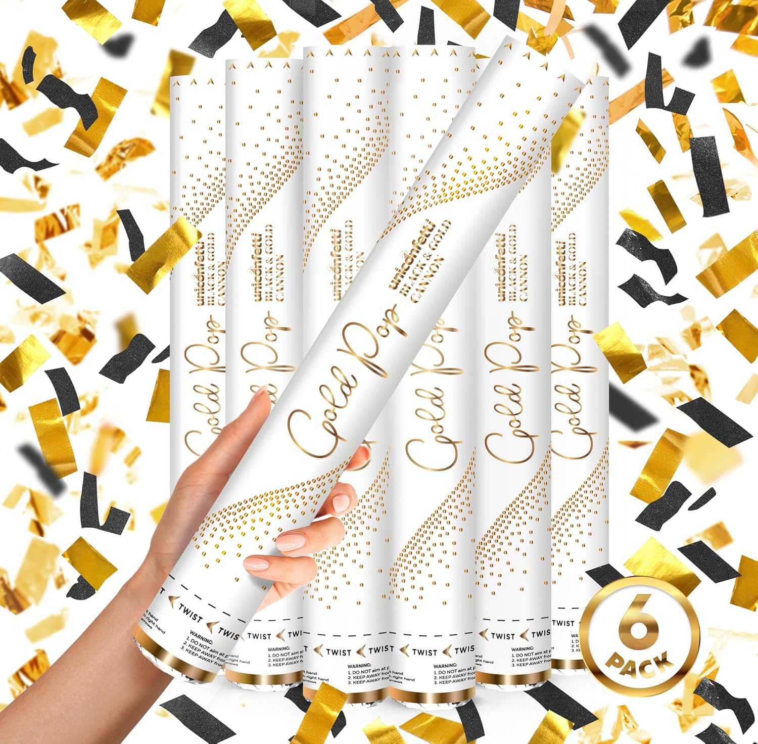 • πŸŽ‰ SUPER LOUD & FUN for any party or occasion - 6 JUMBO-SIZED poppers shooting black & gold confetti papers up to 25 feet, leaving them to dance and twirl in the air. Poppers will shoot with a loud [POP] that will guarantee to get everyone's attention.