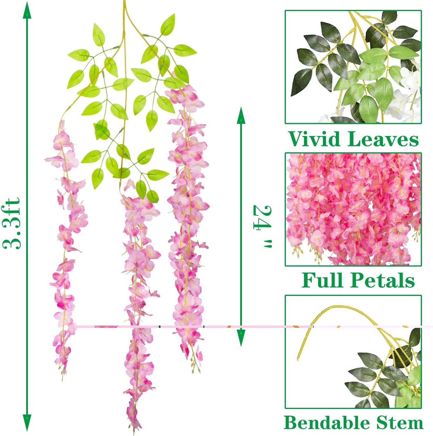 • 🌸Size: Each fake flower vine approx 3.75 Feet in length. Per artificial wisteria with 3 branches flower and 6 branches leaves. Full flowers and rich colors, making the decoration more layered.