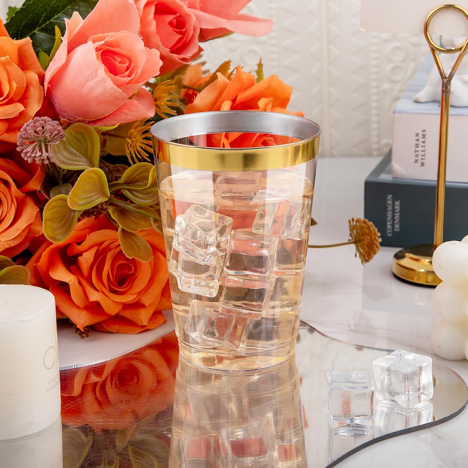 I00000 200 Pack 12 oz Gold Plastic Cups, Clear Disposable Cups, Disposable Plastic Wine Glasses Cocktail Glasses Premium Cups with Gold Rim, 12 Ounce Tumblers for Party & Wedding