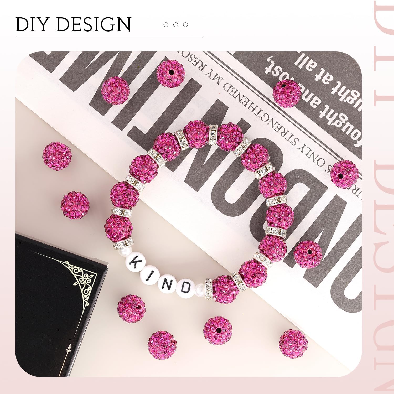 100 pcs 10mm Rhinestone Beads for Jewelry Making, Fuchsia Shiny Round Shamballa Disco Beads Bulk, Sparkle Crystal Clay Christmas for Bracelet Baseball Necklace Earring Crafting and DIY