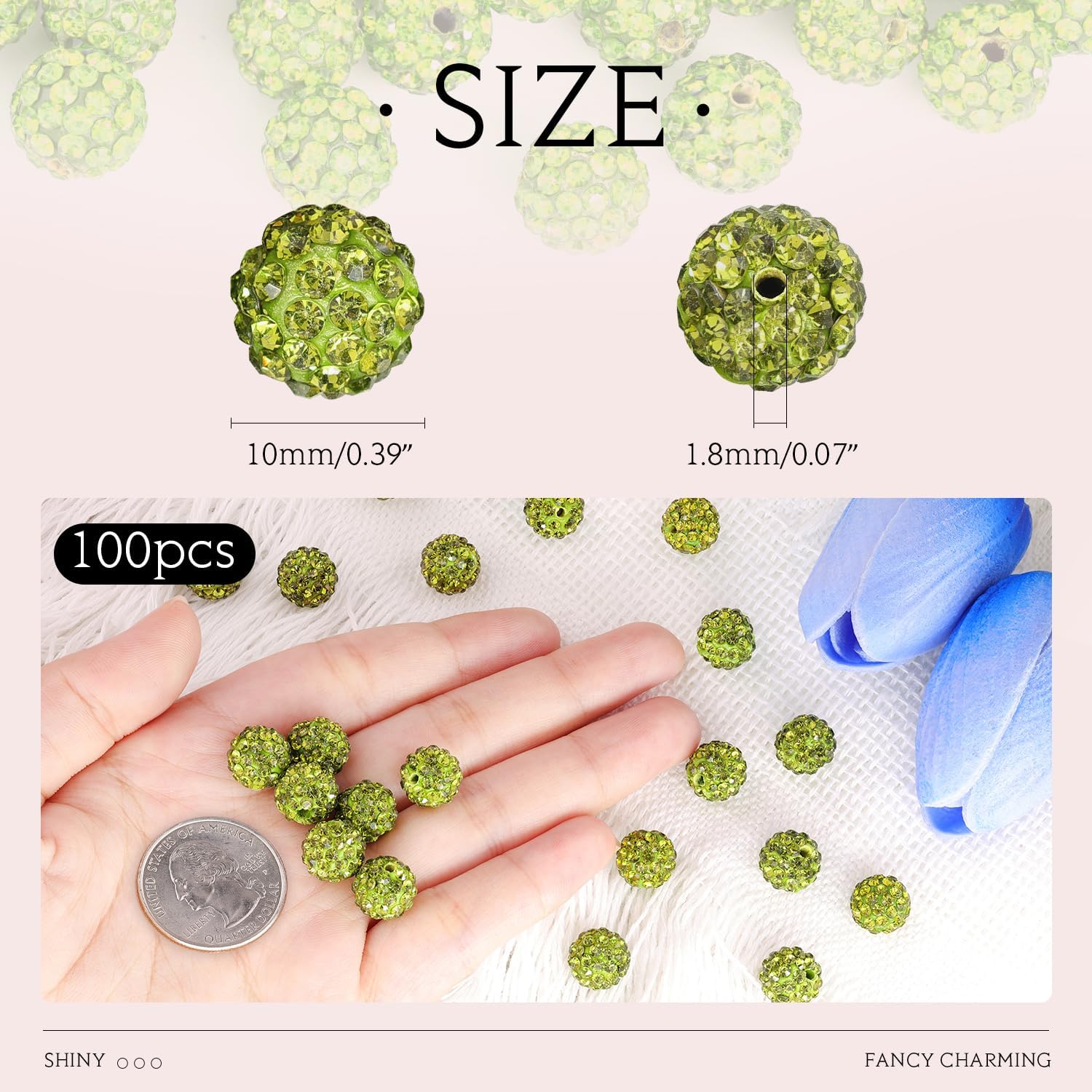 100 pcs 10mm Rhinestone Beads for Jewelry Making, Olivine Shiny Round Shamballa Disco Beads Bulk, Sparkle Crystal Clay Christmas for Bracelet Baseball Necklace Earring Crafting and DIY